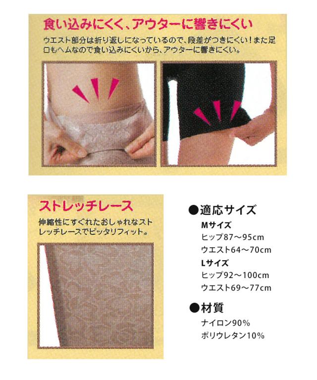 履いた瞬間納得の立体着圧!気になるぽっこりお腹もお尻もまとめてスッキリ!伸縮性にすぐれたおしゃれなストレッチレースでピッタリフィット。ウエスト部分は折り返しになっているので、段差がつきにくい。また足口はヘムなので食い込みにくく、アウターに響きにくい!カラー/ブラック、ベージュ材質/本体:ナイロン80%・ポリウレタン20%、裏側ベルト部:ナイロン90%・ポリウレタン10%、裏側フロント部:ポリエステル100%、クロッチ部:綿100%適応サイズ/M:ヒップ87〜95cm・ウエスト64〜70cm、L:ヒップ92〜100cm・ウエスト69〜77cm洗濯について/洗濯機(ネット使用)