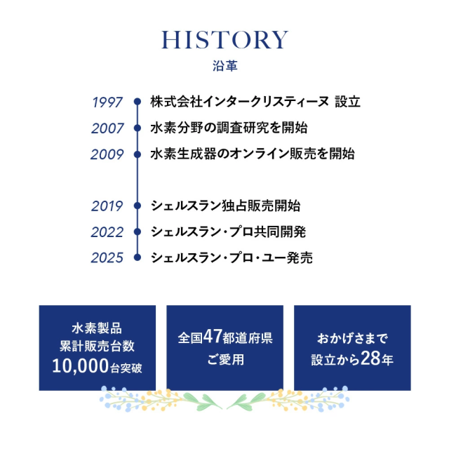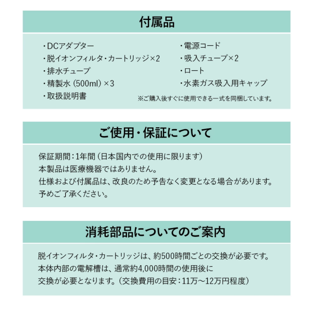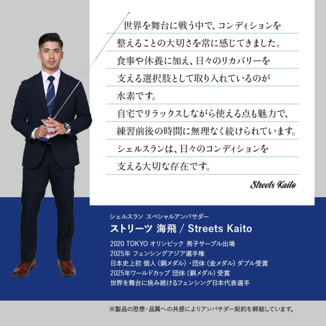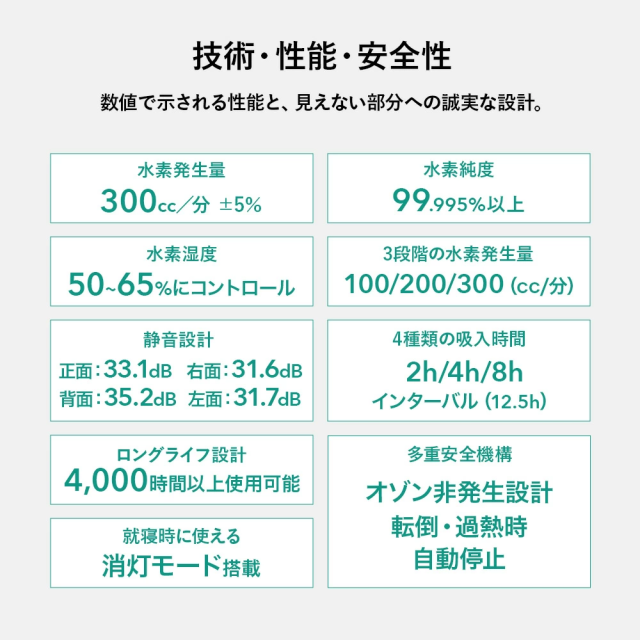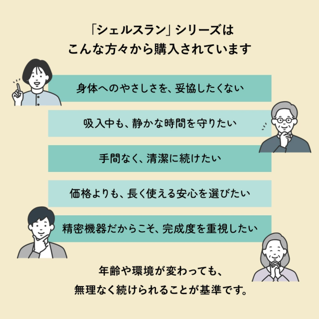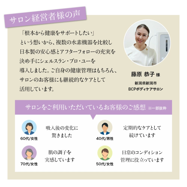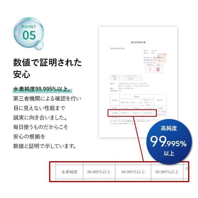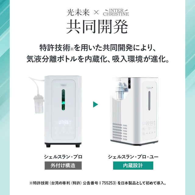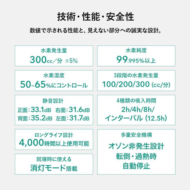 「シェルスラン・プロ・ユー」が新登場 シェルスラン・プロ・ユーは、「安全性」「快適性」「持続性」を高い次元で調和させ、誰もが安心して水素を吸入できる環境を実現することを目指して開発されました。水素発生量300cc/分・純度99.995%という確かな性能に加え、湿度を50〜65%に保つ設計により、のどや気管を乾燥させず、静音性・耐久性・お手入れのしやすさまで、日常的な使用を前提に細部まで磨き上げています。“数字だけでは測れない安心”を、設計と品質で支える。それが、シェルスラン・プロ・ユーの開発思想です。 【1.水素吸入の基準を築き、さらに進化を続けるシェルスラン】 ○水素と酸素を分離して発生するため、水素のみを安全かつ効果的に吸入。 ○東証上場企業の株式会社TYKが99.995%以上の水素純度を証明。 ○水素純度は「チューブの先端(鼻に装着する側)」で99.995%以上。 ○効率的な放熱機構で、安全かつ安心を実現。 ○安全で高効率なPEM式電解コアで、高純度の水素を発生。 ○オゾンを発生しない安全設計。 ○転倒・過熱・水位や水質の異常時に安全のため自動停止。 ※2014年に定められた米国FDA安全基準:人体に安全に使用できる水素の純度は99.995%以上に達する必要があります。 【2.湿度50〜65%の水素ガスで快適に<新基準その1>】 水と水素ガスを分離する機構「PRESSURE BOTTLE」により、人が快適に感じるとされる湿度50〜65%を自動調整機能で維持し、喉・鼻腔を乾燥から守ります。特許技術(台湾の専利(特許)公告番号 I 755253)を日本製品として初めて取り入れ、とことん身体への優しさにこだわりました。 【3.耳でも感じる上質さ<新基準その2>】 静音の技術にも新たな基準をつくりあげました。日本製として初めて、他の追随を許さない飛躍的な静かさを実現しました。就寝中に、またテレビを見ながら、家庭で快適にお使いいただけます。 ※静音性の感じ方には、使用環境や個人差による違いがございます。 【4.お手入れの簡単さ(技術の力)<新基準その3>】 身体に優しい水素を生み出す技術は、使う人への思いやりにも結びつきました。外付けボトルをなくした新構造により、長時間の吸入でもチューブ内に水滴が付きにくく、日々の手間を大幅に軽減しました。日本製として初めて実現した、この先進技術が快適な体験を支えます。 【5.水素の摂り入れは、5つのルートから】 <鼻から吸入チューブで> いちばん自然な、毎日のスタイル。吸入チューブを鼻に軽く添えるだけ。普段の呼吸に合わせて、水素が無理なく体の奥へと行き渡ります。リラックスした時間に寄り添う、スタンダードな吸入スタイルです。 <目から> 別売りの専用パーツ「アイウェア」によってやさしく、澄んだ感覚を <耳から> 別売りの専用パーツ「耳チューブ」による上質なリラクゼーションを <口から> 別売りの専用パーツ「マウスチューブ」によって鼻からの吸入が難しい方にも <水素飲料として> お子さまやペットにも最適。2分間で1.6ppmの飽和水素水を別売りの専用「水素水生成タンブラー」で生成。 ※タンブラーの耐熱温度は80℃程度までです。 【6.お届けした瞬間から始まるサポート】 当社では、お客さまとの”つながり”をとても大切にしています。製品をお受け取りいただいたその日から、専任スタッフが直接サポートさせていただきながら、伴走します。これからも安心と真摯な取り組みを積み重ねながら、末永くお付き合いさせていただきます。 (電話による相談受付:10:00〜18:00 土日・祝日を除く) |
