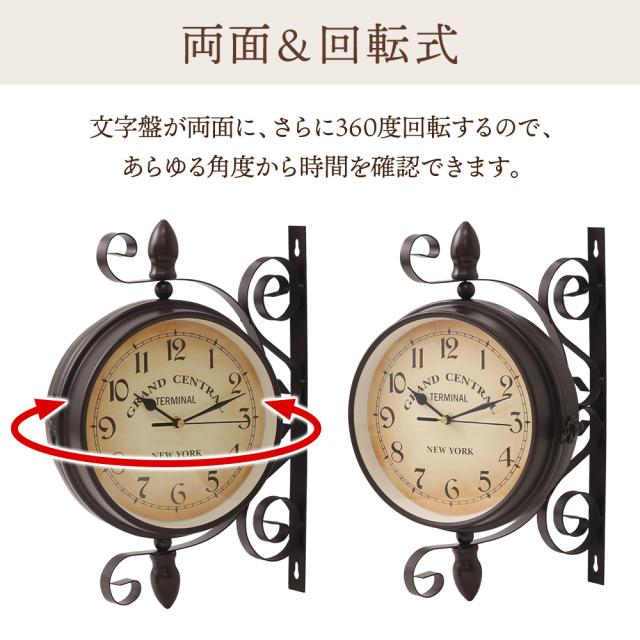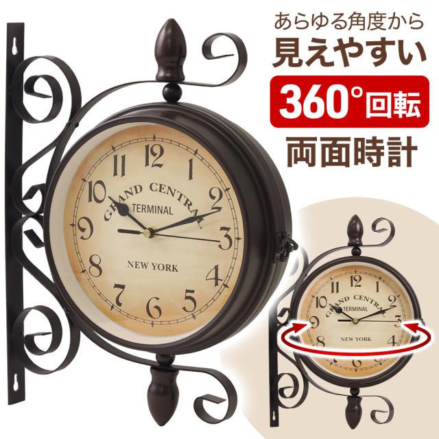 掛け時計 レトロ アンティーク 両面 360度回転 両面掛け時計 おしゃれ インテリア 電池式 アンティーク風 西洋 北欧風 スタイル 雑貨 引っ越し祝い 誕生日 プレゼント ギフト
