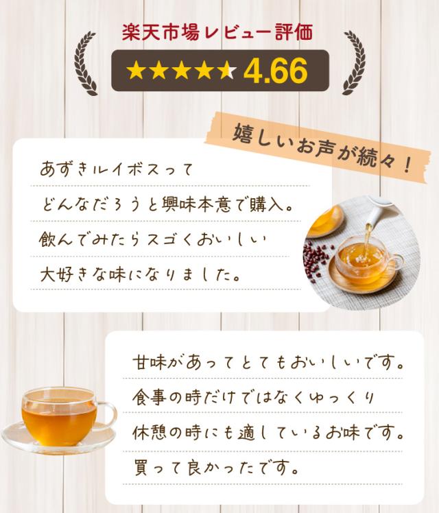 - あずきが体に良いことを知り、購入してみました。ルイボスティーも、入っているからなのか非常に飲みやすくて美味しかったです。何度もリピ買いしています。