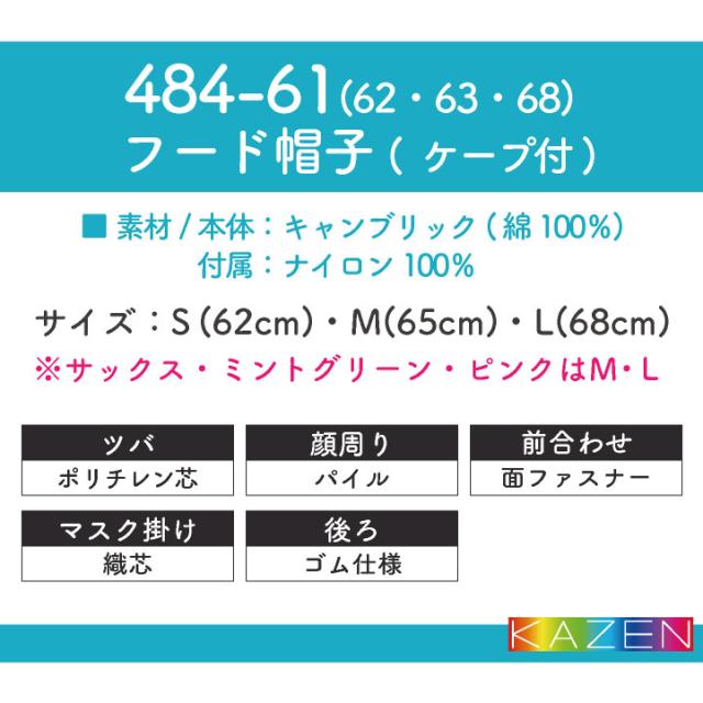 484-61 カゼン フード帽子 男女兼用 吸水性・耐久性に優れた面100%素材。