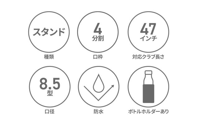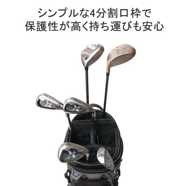 | 仕様 | <外側> ジップポケット(L)×1 └ 内蔵 ポケット(XS)×2 ポケット(L)×1 ジップポケット(M)×2 メッシュジップポケット(M)×1 ベルクロポケット(M)×1 マグネットポケット(S)×1 ボトルホルダー×1(保冷効果付き) <付属品> ショルダーストラップ×1 ネームプレート×1 クラブキャリーケース×1 |