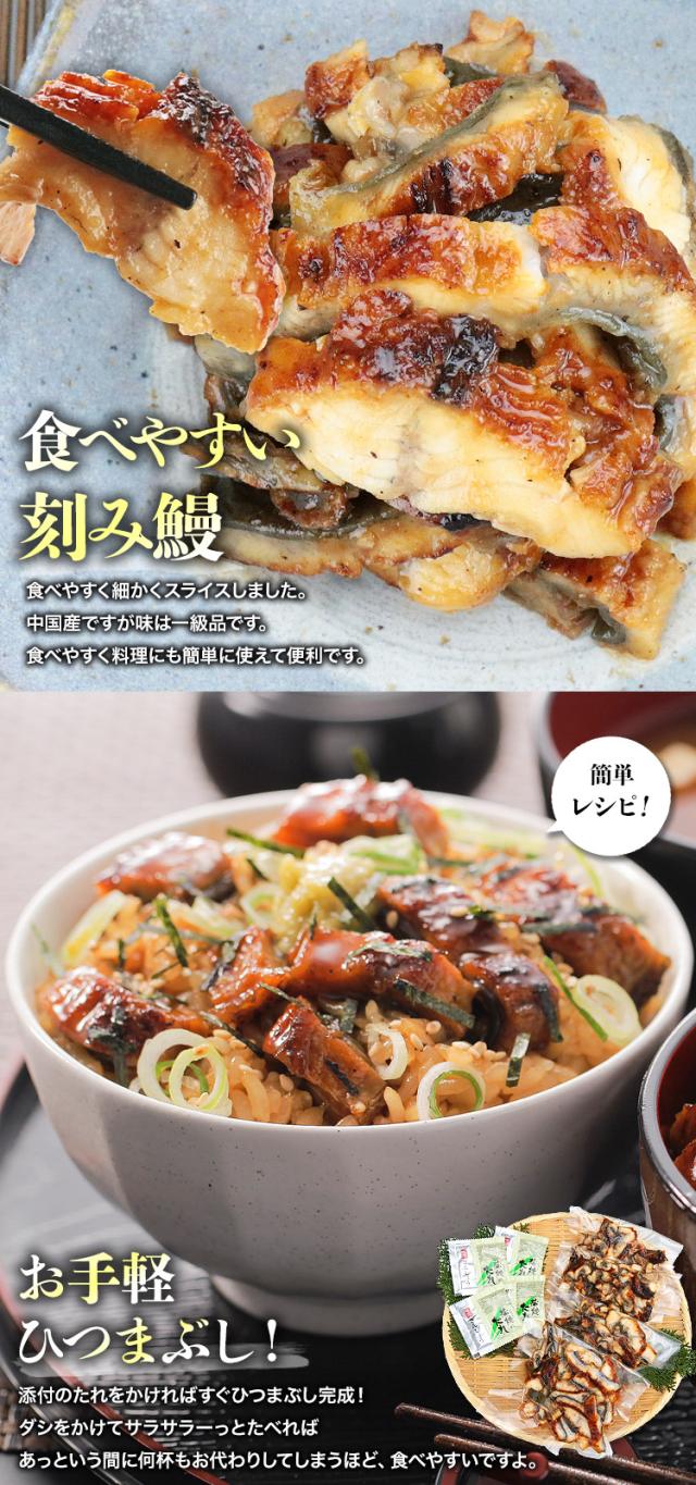 うな丼と同じ肉厚で脂がのった正規品のうなぎ蒲焼きを、食べやすく細かくスライスしました。