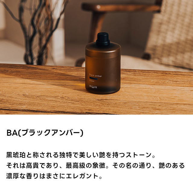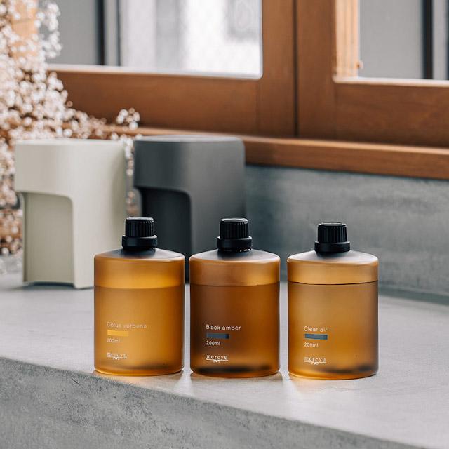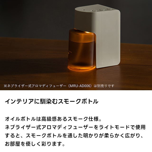スモーク処理を施した高級感あるボトルで、ネブライザー式ディフューザーに装着しライトをつけると、ボトルを通して柔らかに広がる明かりを楽しめます。