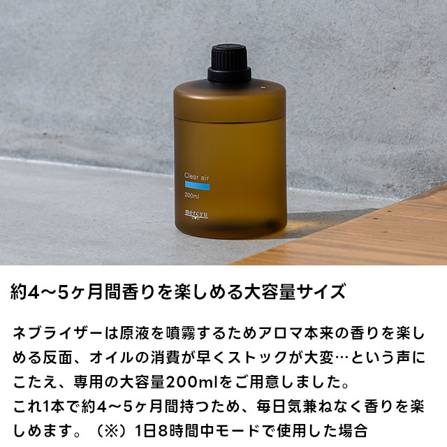 アロマオイルの消費が早いネブライザー式ディフューザーでも、約4〜5ヶ月間香りを楽しめる200mlの大変お得な大容量ボトルです。