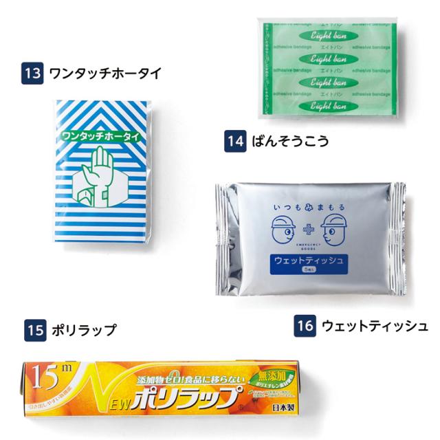 持出しバッグ、給水バッグ3L、軍手、ホイッスル、ウェットティッシュ、ゴミ袋(3枚)、防災の心得帳、不織布マスク(3枚)、アルミブランケット、ボールペン、メモ帳、圧縮タオル、ポリラップ、綿棒、ばんそうこう、ワンタッチホータイ、ニゲニゲスモークパック(2個)、カイロ(2個)、簡易トイレ、紙せっけん、アイマスク、エアネックピロー、スリッパ、巾着袋(アイマスク・エアネックピロー・スリッパの収納用の巾着袋)、蓄光ダイナモ式充電ラジオライト