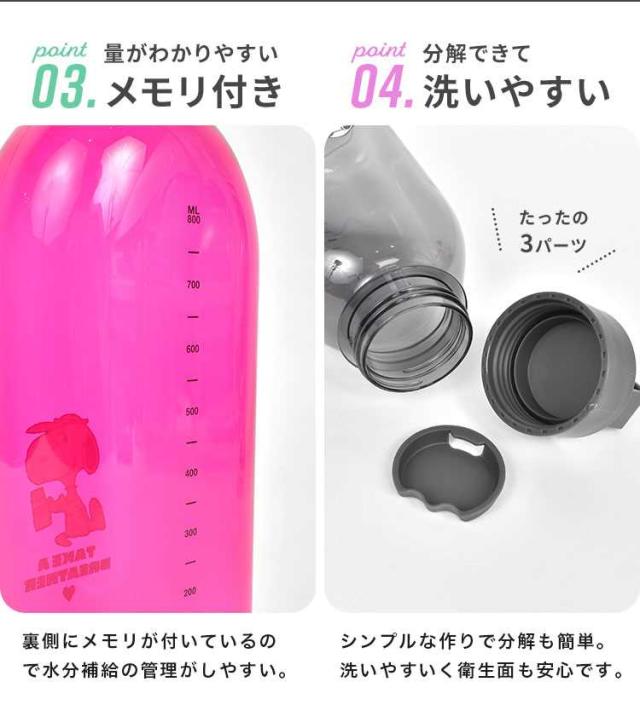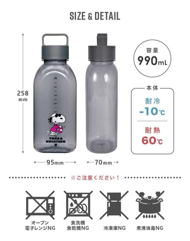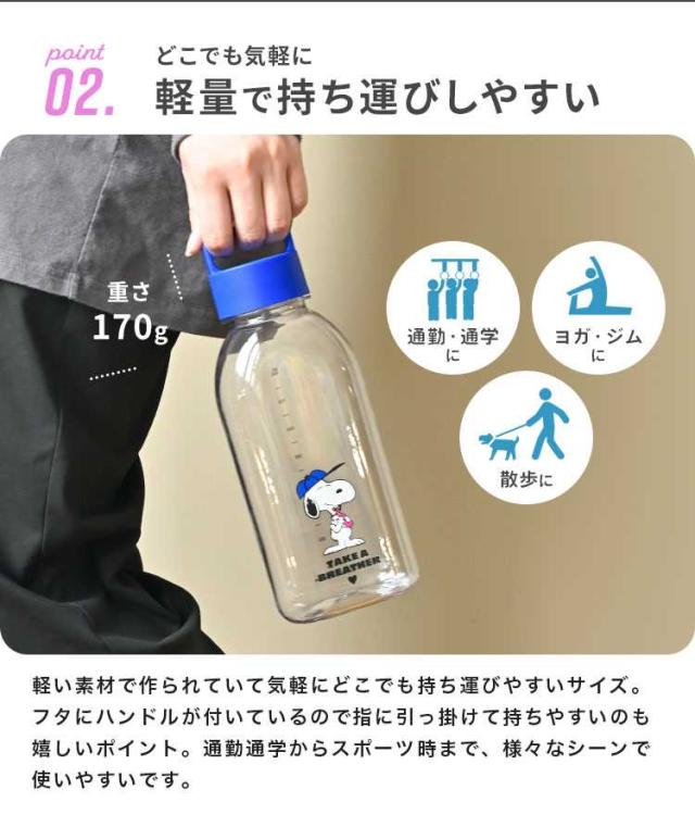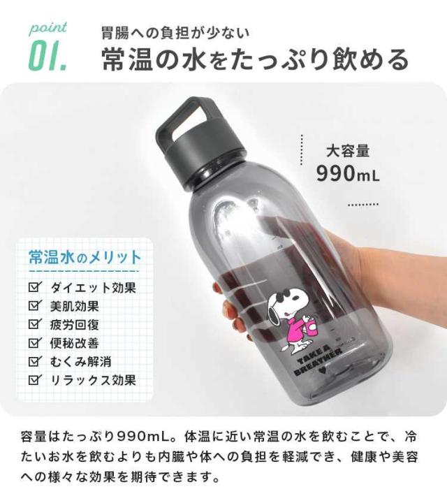 スヌーピーのイラストが可愛いドリンクボトル。大容量の990mLで健康や美容にいい常温水がたっぷり飲めます。軽くて使いやすいクリアタイプで透明感がおしゃれ♪キャップにハンドルが付いているので持ち運びやすいく、ジムやヨガ、ウォーキング時におすすめです。通勤、通学にも◎メモリ付きでどれくらい飲んだかもわかりやすく、シンプルな作りなので分解しやすくお手入れも簡単です。