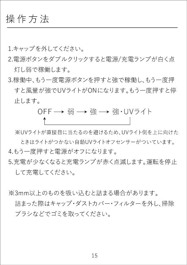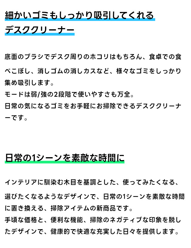 モードは弱/強の2段階で使いやすさも万全。日常の気になるゴミをお手軽にお掃除できるデスククリーナーです。