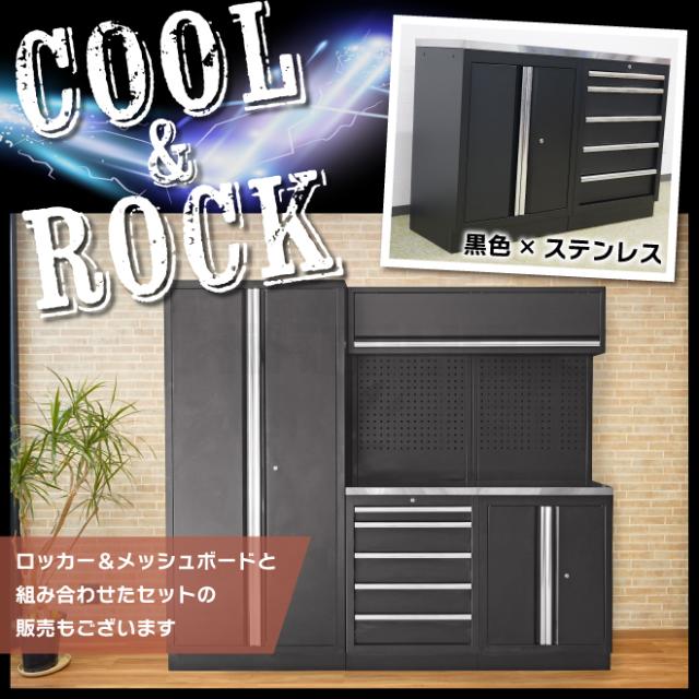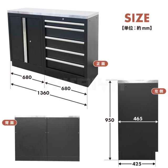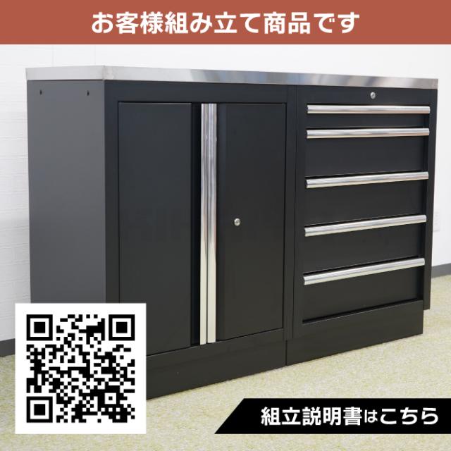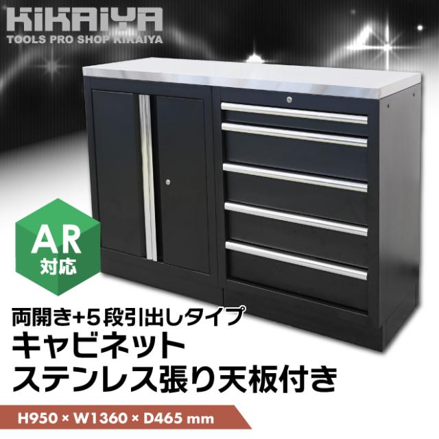 ガレージ キャビネット ステンレス天板 両開き扉 5段引出し 収納 作業台 ブラック スチール H950×W1360×D465mm KIKAIYA