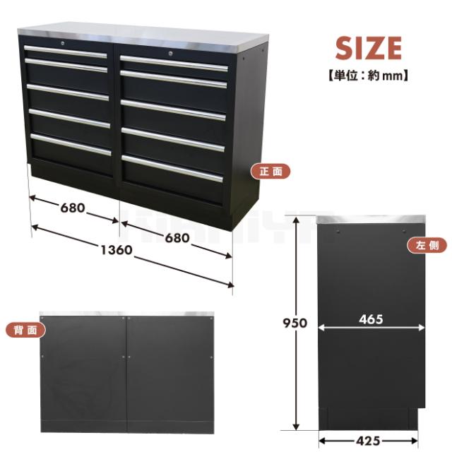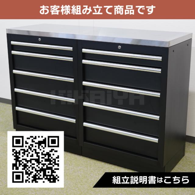 ガレージ キャビネット ステンレス天板 5段引出し 収納 作業台 ブラック スチール H950×W1360×D465mm KIKAIYA