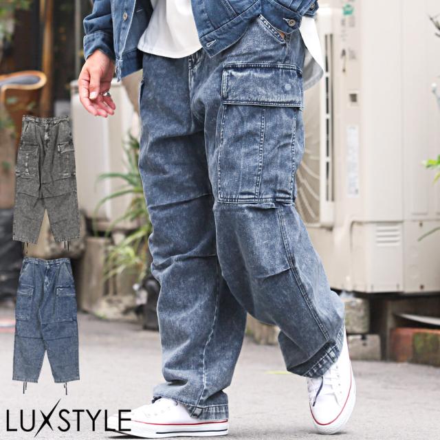 デニムパンツ カーゴ メンズ ワイド 色落ち ケミカル加工 イージーパンツ インディゴ【ケミカル加工デニムワイドカーゴパンツ】 aa-2785