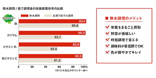 無水調理でゆでた野菜は、栄養素の流出を最小限に抑えられます。調理後もその8〜9割をキープできるので、素材の栄養素をほとんど丸ごと摂取できます。