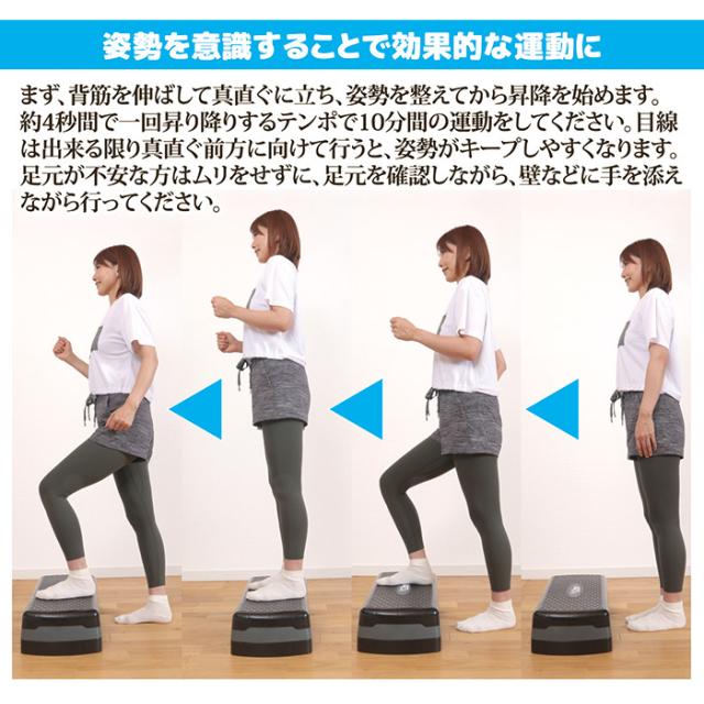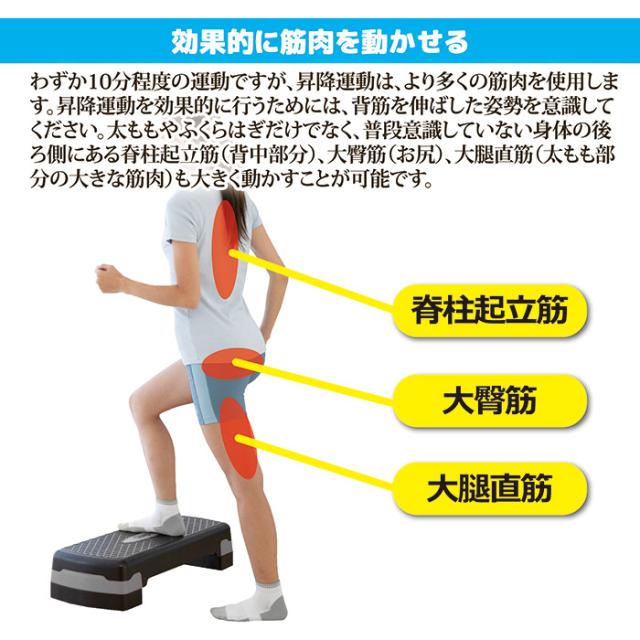 わずか10分程度の運動ですが、昇降運動は、より多くの筋肉を使用します。昇降運動を効果的に行うためには、背筋を伸ばした姿勢を意識してください。太ももやふくらはぎだけではなく、普段意識していない身体の後ろ側にある脊柱起立筋(背中部分)、大臀筋(お尻)、大腿直筋(太もも部分の大きな筋肉)も大きく動かすことが可能です。