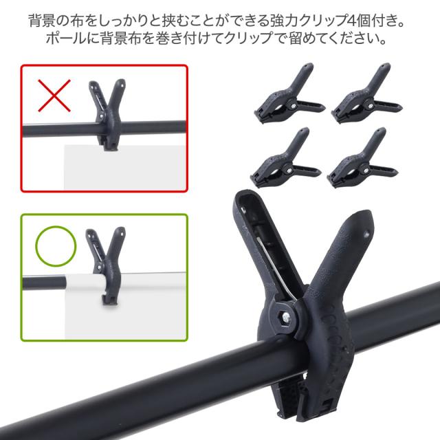 お好みの背景布を付属のクリップで挟むだけで簡単に使用できます。