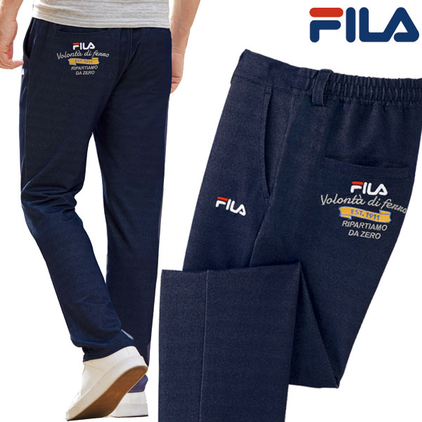 後ろポケットの刺しゅうがポイントの「FILA」のデニム風ストレッチパンツ。ストレッチ素材を使用したはき心地の良いデニムパンツです。ウエストは総ゴムで楽々。股下は65・70cmの2レングスから選べます。
