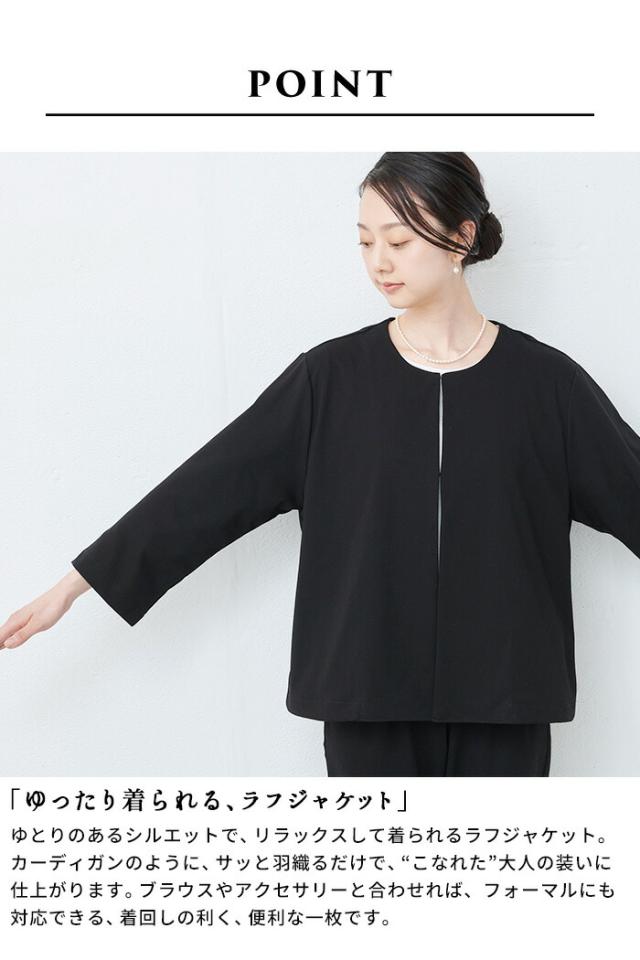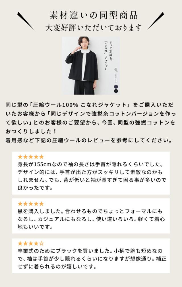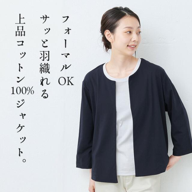 強撚糸コットン100% こなれ ジャケット 日本製 / 接触冷感 ジャケット レディース 黒 フォーマル 40代 50代 30代 ノーカラー 紺 黒 フォーマル 卒業式 入学式 結婚式 顔合わせ 七五三 母 ママ 仕事 オフィス 綿100 ゆったり ウォッシャブル 手洗い可能 洗える
