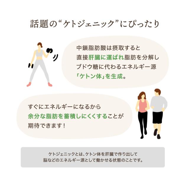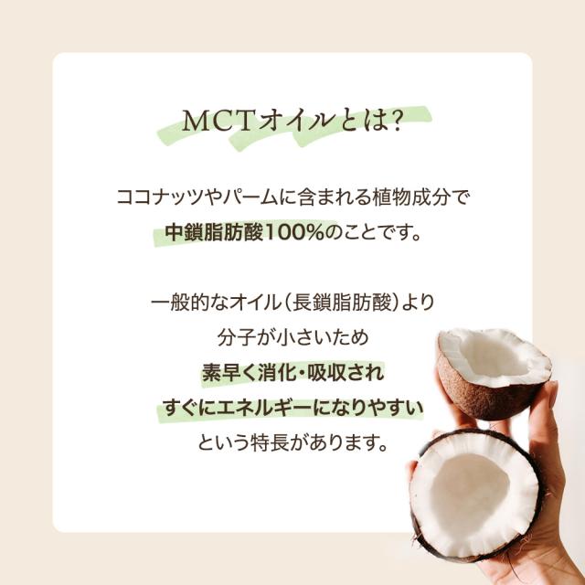 ケトン体生成: MCTオイルは糖質に変わるエネルギー源であるケトン体を素早く多く作れる特性があります。そのため、糖質制限中の人やアスリートにも役立つオイルとして利用されています。