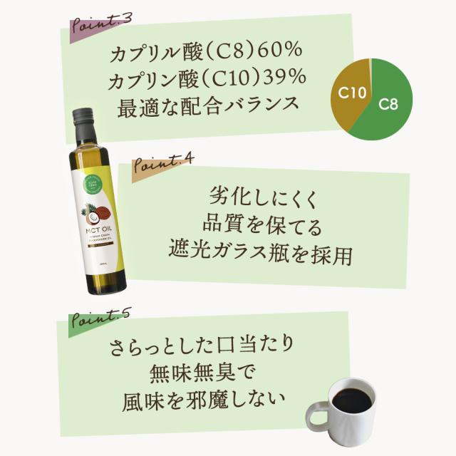| 栄養成分表示(100gあたり) | エネルギー・・・・・899.00 Kcal タンパク質・・・・・0.00 g 脂質・・・・・・・・99.90 g (-飽和脂肪酸・・・・ g) (-トランス脂肪酸・・ g) (コレステロール・・・0 mg) 炭水化物・・・・・・0.00 g 食塩相当量・・・・・0.00g (中鎖脂肪酸・・・・・100%) C8 カプリル酸・・・・・60.15g C10 カプリン酸・・・・・39.68g ラウリン酸・・・・・0.17g |