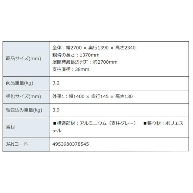 広げた際の傘のサイズは幅270×139?と大きく開き、庭にしっかり日陰を作り、快適にお庭で過ごすことができます。