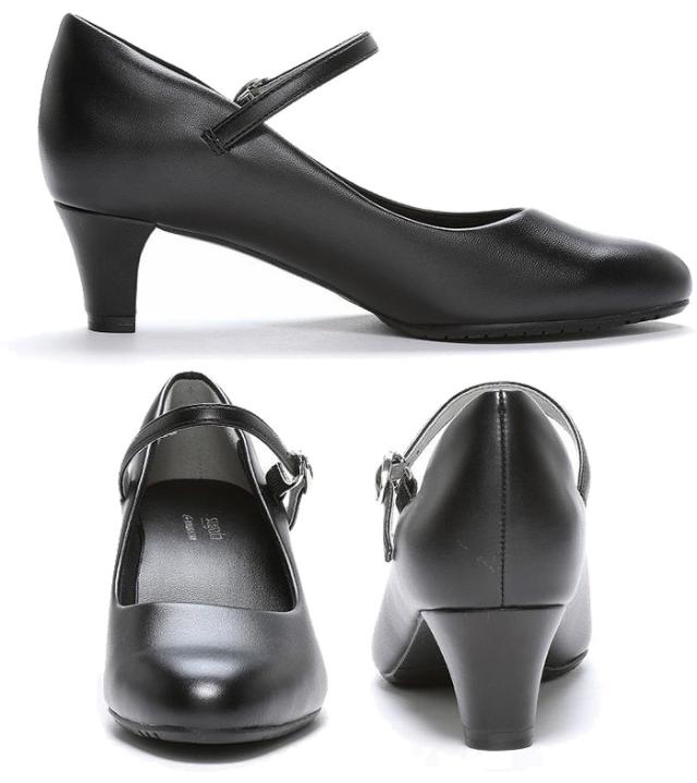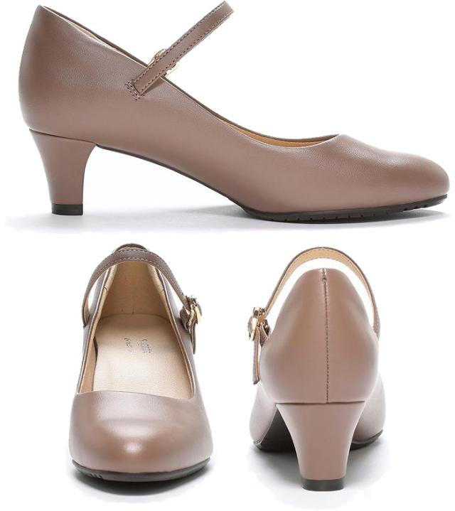 調節可能なストラップ付きで、かかとのすっぽり抜けを防止します。きちんと感が必要な場面にも心強い一足です。ヒールの高さは5cm、重量は23.0cmで片足約205gです。