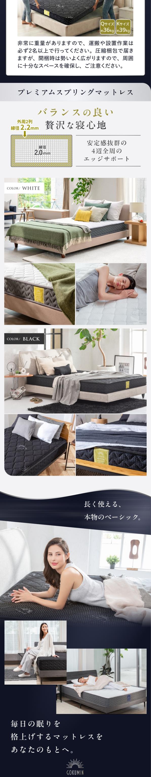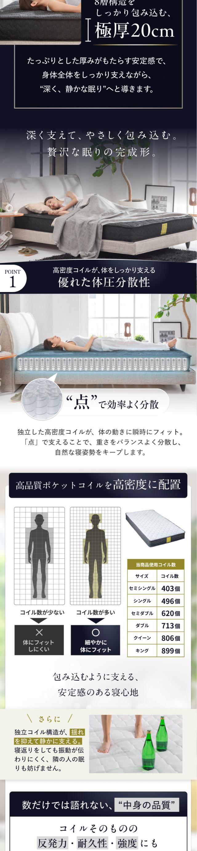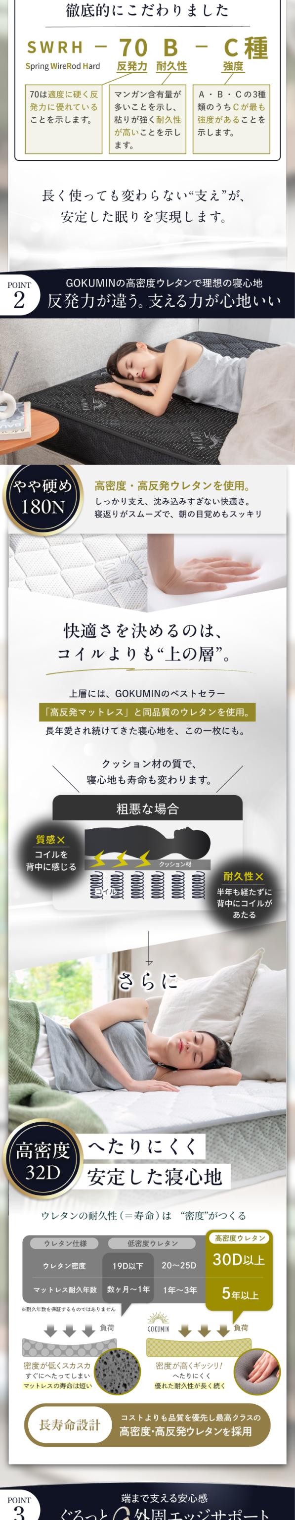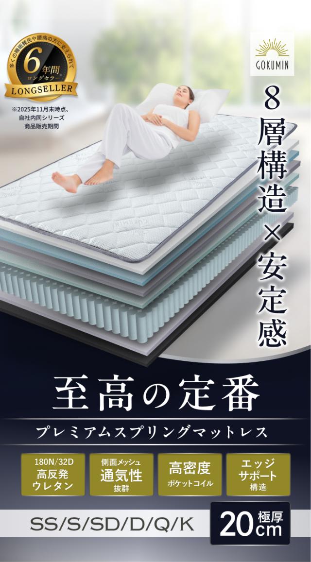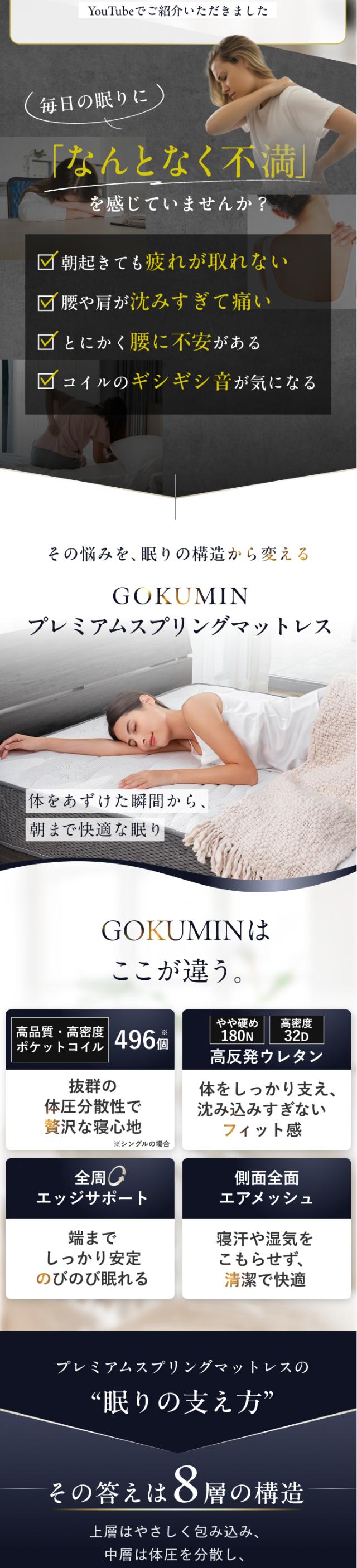 【高反発スプリングマットレス】「高密度496個ポケットコイル」×「No.1獲得の高反発ウレタン」により、体の字ラインに合わせてフィットし、体圧を分散。睡眠中にお客様の体をしっかり支え、無理のない自然な姿勢で朝まで快適に眠れます。またボンネルコイルより安定し横揺れしにくく、ぐっすり寝られます。長く使うマットレスが欲しい。睡眠が浅く悩んでいる方等に最適です。【通気性に優れた並行配列コイル】「並列コイル採用」×「3Dメッシュ生地」で適度に隙間があるため通気性がよく、低価格のマットレスではない、2.0mmと2.2mmの高品質コイルで長期寿命を実現。結果的に経済的にも優れております。【だから安心!日本企業8年間品質保証】ご購入後8年のメーカー直営品質保証。初期不良もその後の不具合も安心してお使いいただけます。【商品詳細】マットレス本体/日本語取扱説明書・よくあるご質問集/高級化粧箱、サイズ:幅約97cm×奥行約195cm×高さ約20cm、化粧箱サイズ:32×32×105cm、重量:約22kg、型番:PSMS-01、日本企業開発・イタリアデザイン・中国専用工場生産【日本人技術者のこだわりをお確かめください】GOKUMIN ゴクミン ごくみん