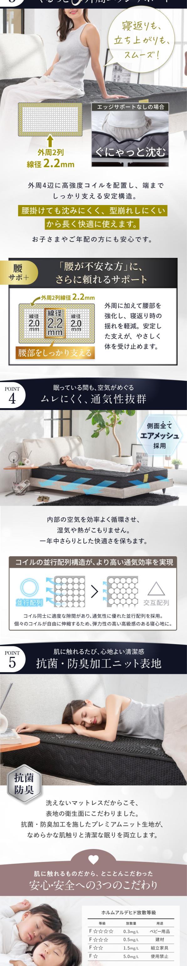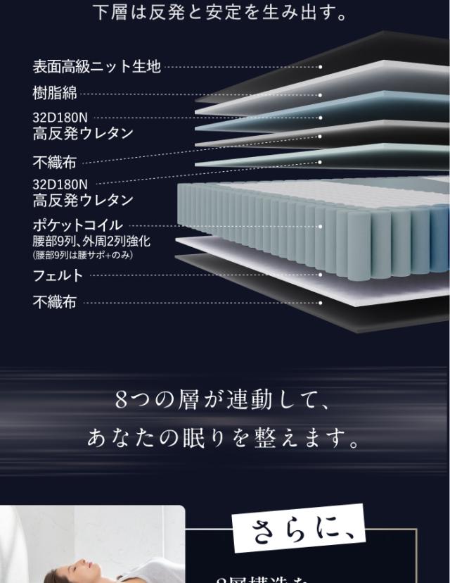 | 素材 | ●外装生地の組成 ・表面ニット生地:ポリエステル65%、レーヨン35% ・側面生地:ポリエステル100% ・裏面生地:ポリエステル100% (不織布) ●中材 ・コイルスプリング SWRH70B-C種 ・ウレタンフォーム |