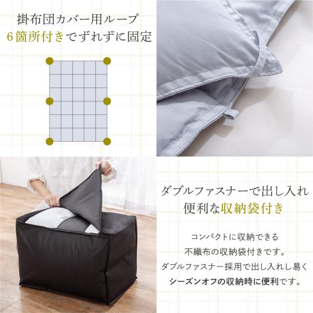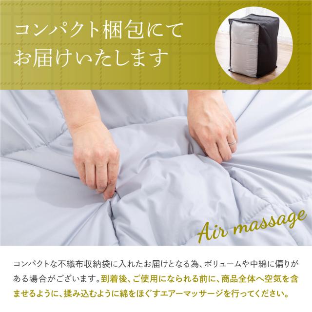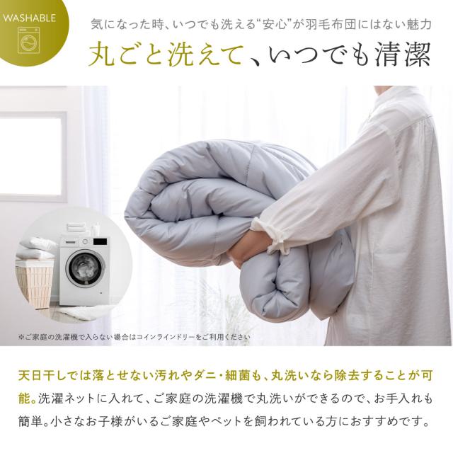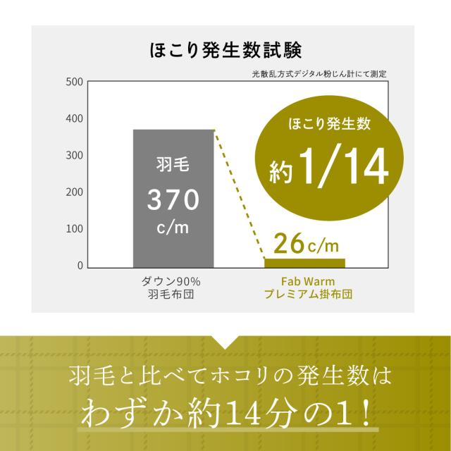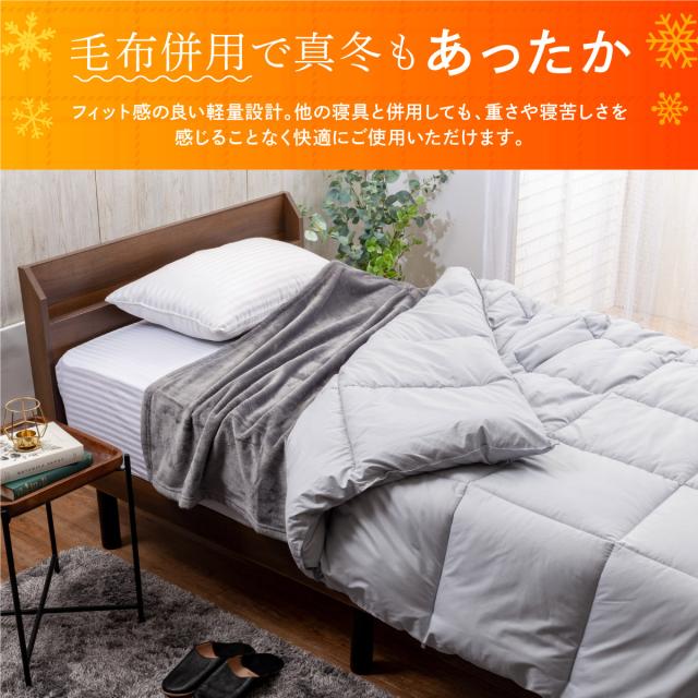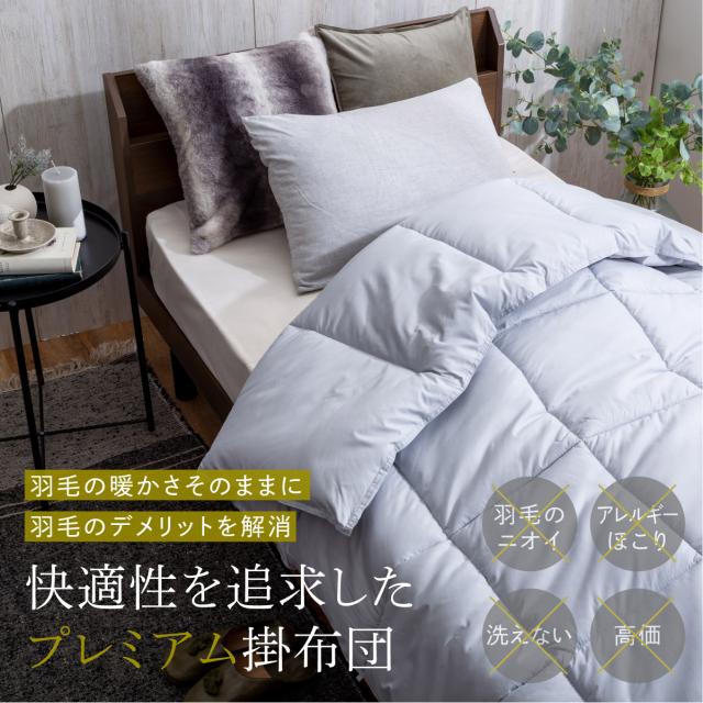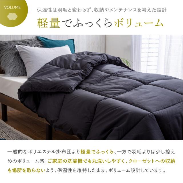 【羽毛と同等のあたたかさ】吸湿発熱素材と、羽毛のようにたっぷりと空気を含む特殊な人口羽毛綿を、独自ブレンド開発した中綿を使用。羽毛布団と保温性を比較し、5時間たっても羽毛と変わらない暖かさを維持。【ほこりの発生数は羽毛の1/14】ダウン90%の羽毛布団とほこりの発生数を比較し、約1/14という少なさ。【抗菌防臭加工】【洗濯OK】ご自宅でメンテナンスが可能なように、中綿には抗菌防臭加工が施されており、大きめの洗濯ネットに入れて洗濯機で丸洗いが可能。【軽量でふっくらボリューム】一般的なポリエステル掛布団より軽量でふっくら、一方で羽毛より少し控えめのボリューム感にすることで、ご自宅で丸洗いしやすく、クローゼット収納も場所を取らないよう工夫。【フィット感UPキルト】高密度の光沢感のある側生地と30マスキルトを採用。【収納袋付き】コンパクトに収納できる不織布の収納袋に入れてお届け。サイズ:シングルサイズ:約150×210cm側生地:ポリエステル100%(光沢加工)中綿:ポリエステル70%レーヨン30% 製品重量:約1.65kg商品企画/開発:日本デザイン:イタリア生産国:中国専用工場
