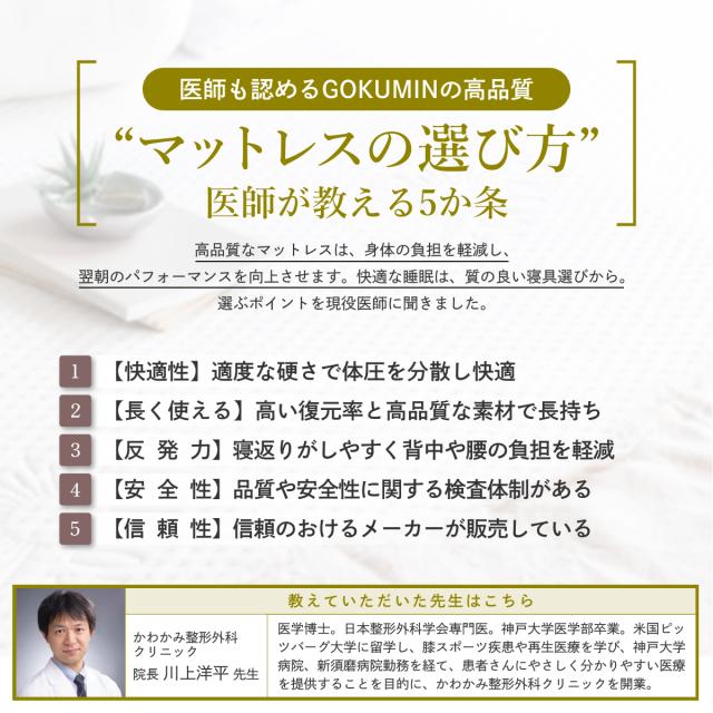 【極厚15cm・4層マットレスついに誕生】「低反発、高弾性、180N/250N高反発の4層構造、5パターン」×「リバーシブルカバー」×「特殊凸凹加工」×「竹炭消臭」×「55D-34D高品質ウレタン」で125通りの寝心地が試せる画期的マットレス。 GOKUMINだからこそ実現できたこれぞTAKUMIのマットレス。【1枚で12倍長持ち】4層構造と3つ折りとすることで、一番ヘタリやすい腰部を、頭部や足部と入れ替えご利用いただけます。【こんな方におススメ】異なる硬さを試してみたい(低反発/高弾性/180N/250N)。底付きしやすい低反発マットレスでは体が合わない。すばらしい睡眠を手に入れたい という方にぴったりです。【収納便利×洗えるリバーシブルカバー】 夏・冬試せるリバーシブルカバー。毎日使うものだから、GOKUMINは専用の抗菌防臭加工・低ホルムアルデヒド・通気性抜群のマットレスカバーであなたの快適な睡眠をサポート。【商品仕様】製品サイズ:約97×195×15cm、 製品重量:約13.5kg、化粧箱サイズ:30×30×105cm、付属品:取扱説明書、高級化粧箱、生産国:中国専用工場生産 【日本人技術者のプライドを是非ご体感ください】ゴクミン ごくみん