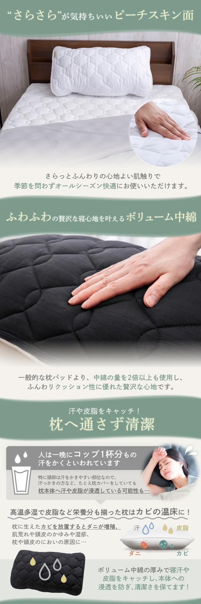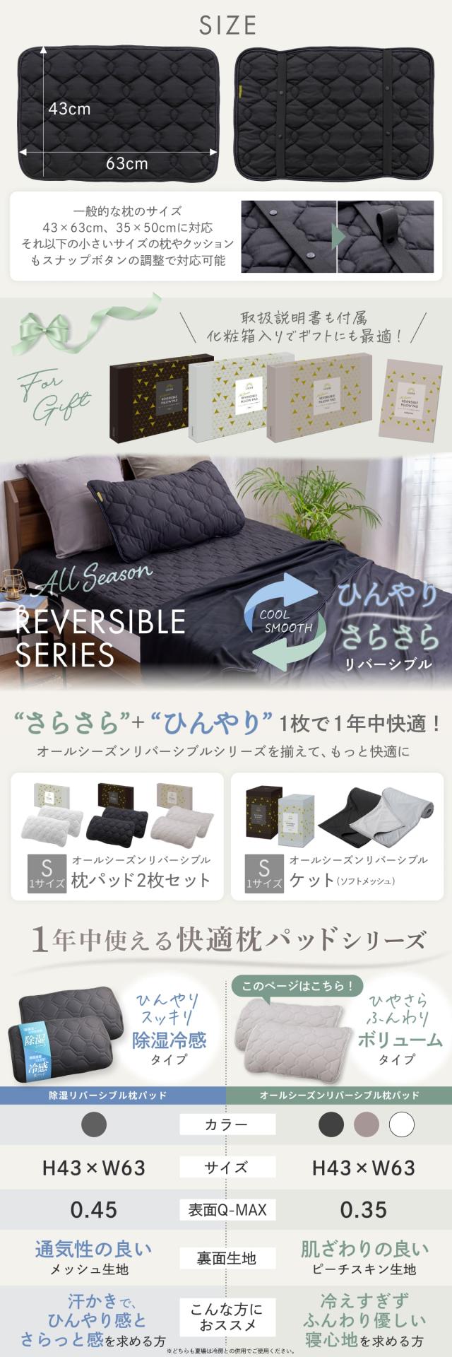 【ゴムバンドで着脱簡単 サイズ調整可能】ゴムバンドで枕カバーより装着が簡単!35×50cm、43×63cmの一般的な枕に対応。小さな枕やクッションにもお使いいただけます。【接触冷感×さらさら 1年中使える両面仕様】夜間熱中症対策におすすめ!冷たすぎるのが苦手な人にもお使いいただけるように独自ブレンド生地採用。吸水速乾性にすぐれ、冷たすぎず心地よく快適に安眠できます。【丸洗いOK 2枚セットでお得】汗ばむ季節の洗い替えや、ご家族分に使える便利な2枚セット。吸水速乾生地で毎日のお洗濯も楽々。【ボリューム3層構造で寝汗をキャッチ】「あせもや肌荒れ」「頭皮のかゆみやニオイ」を引き起こす原因となる寝汗や皮脂をしっかり吸収。【商品仕様】オールシーズンリバーシブル枕パッド2枚セット サイズ:約43×63cm●商品重量 約180g/1枚当たり●化粧箱サイズ31×22×3cm●付属品:取扱説明書●プレゼントにも最適な高級化粧箱●カラー:ブラック/ホワイト/グレージュ●安心の1年間保証書 【素材】表地:冷感ナイロン50%冷感ポリエステル50% 裏地/中綿:ポリエステル100%●製造国:日本企業開発/イタリアデザイン/中国専用工場生産