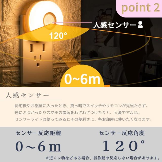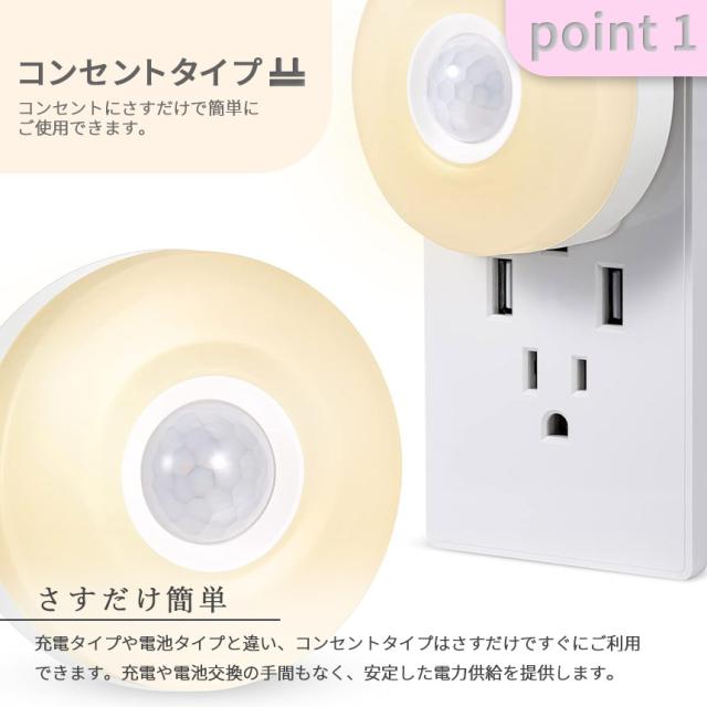 【自動点灯のコンパクトセンサーライト】暗闇で動きに反応して点灯する、小さくても明るいセンサーライトです。昼間は消灯、暗くなって動きを感知して点灯するので、つけたり消したりの手間いらず。コンセント式で、充電の手間や、電池交換もいりません。