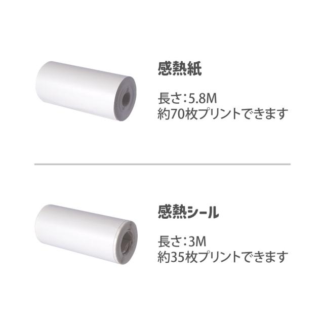 | サイズ(約) | 感熱紙:幅57mm×全長5.8m(約70枚プリント可)、感熱シール:幅57mm×全長3m(約35枚プリント可) |