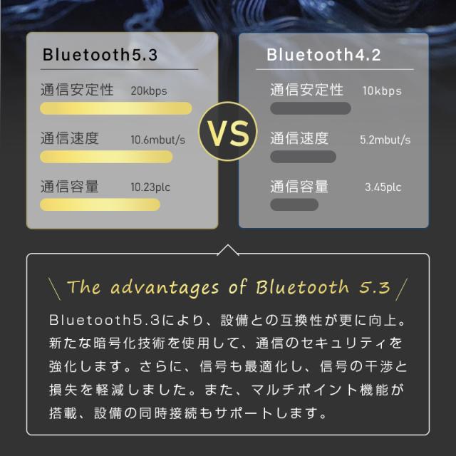 最新のBluetooth 5.3は、信号干渉やデータ伝送ロス、音楽のドロップアウトなしで、旧バージョンより2倍の伝送速度とより安定した接続を実現します。また、本製品はBluetooth携帯電話やシステムと幅広く互換性がありまして、異なるOSでも2台のデバイスと同時に接続可能です。