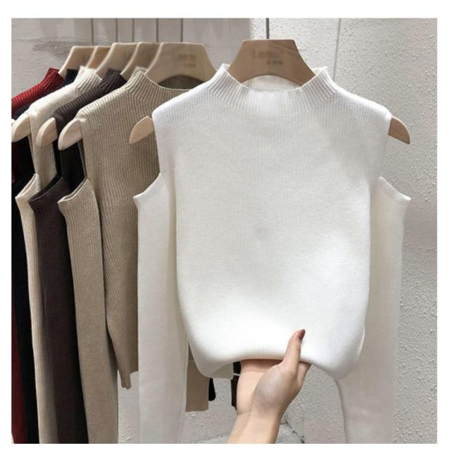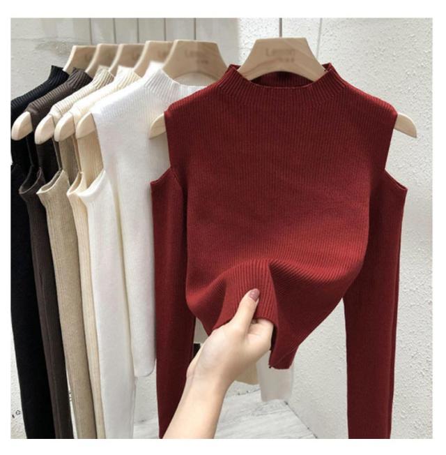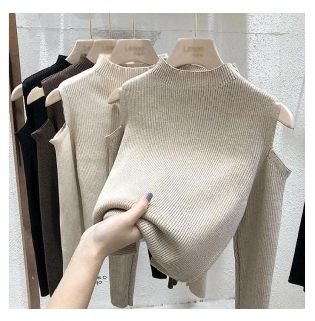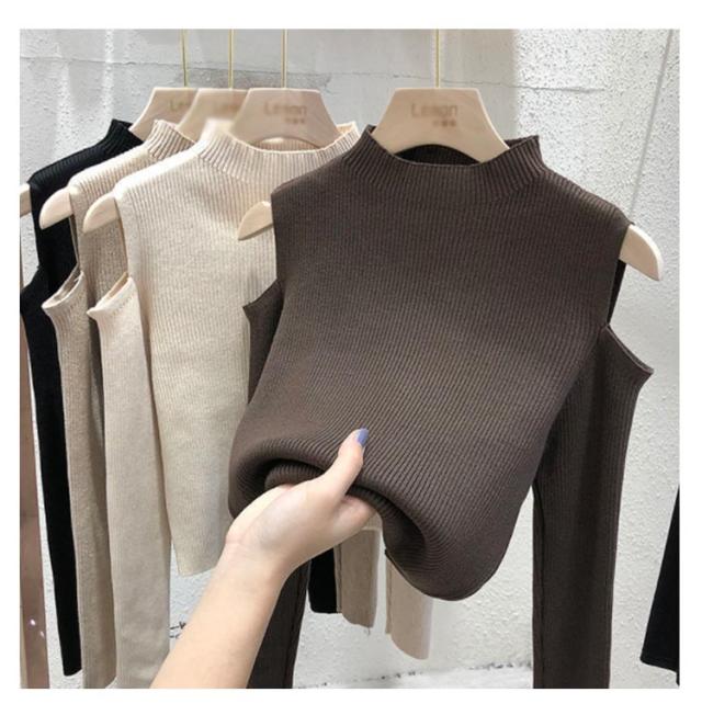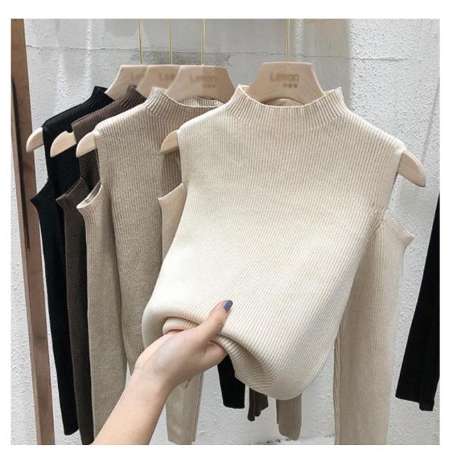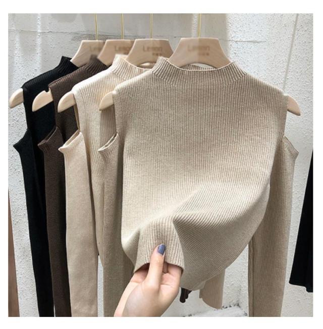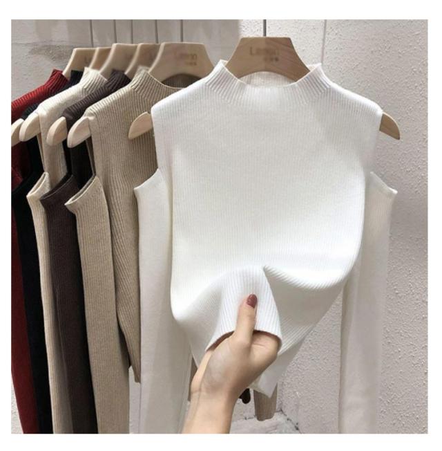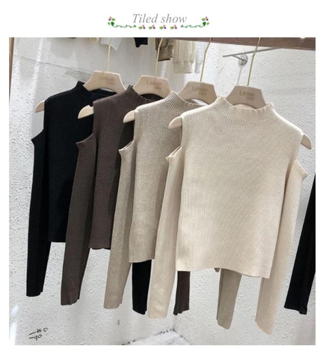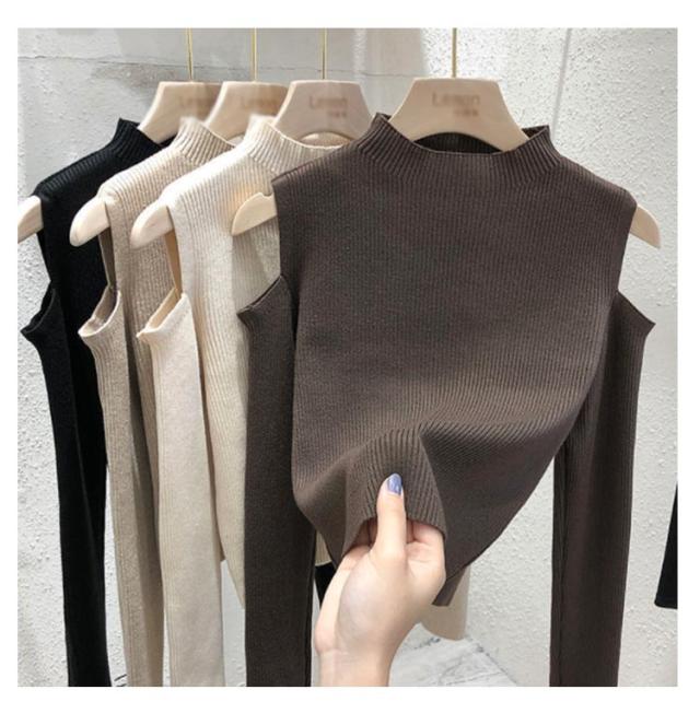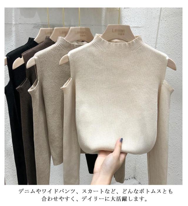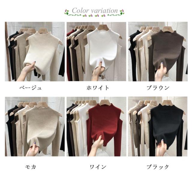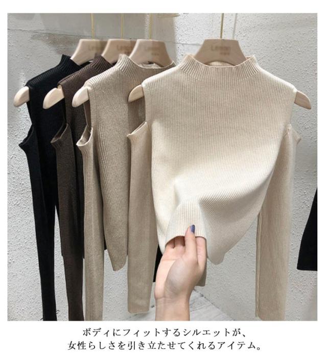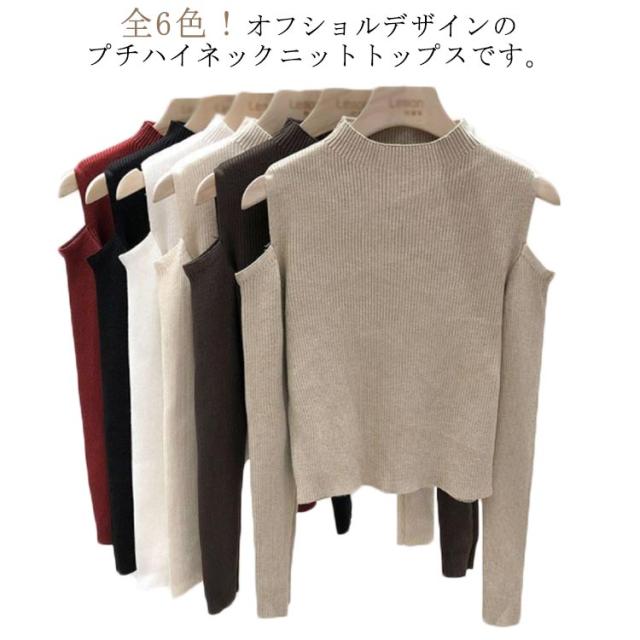 肩出しニット レディース ニット プチハイネック 肩出しニット 全6色 トップス 肩開き 肩だし 肩見せ 着やせ シンプル 長袖 ボトルネック 無地
