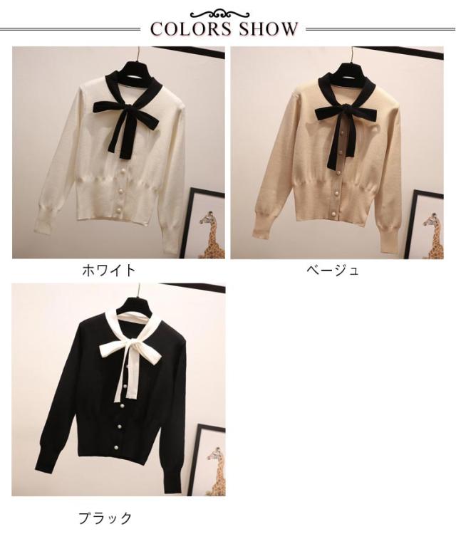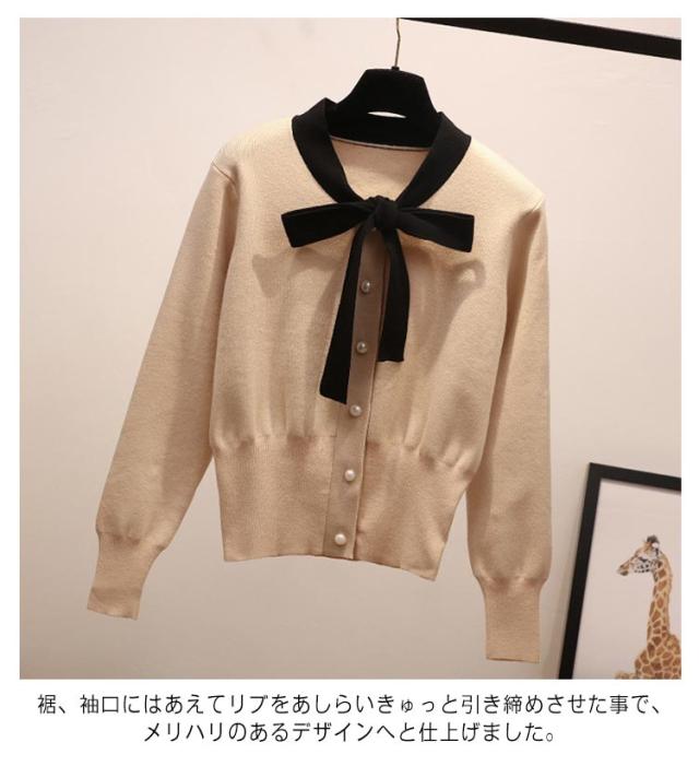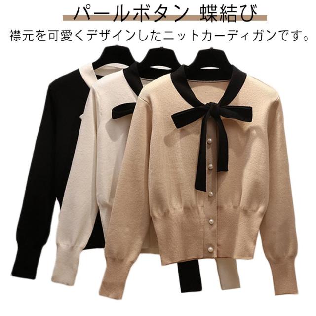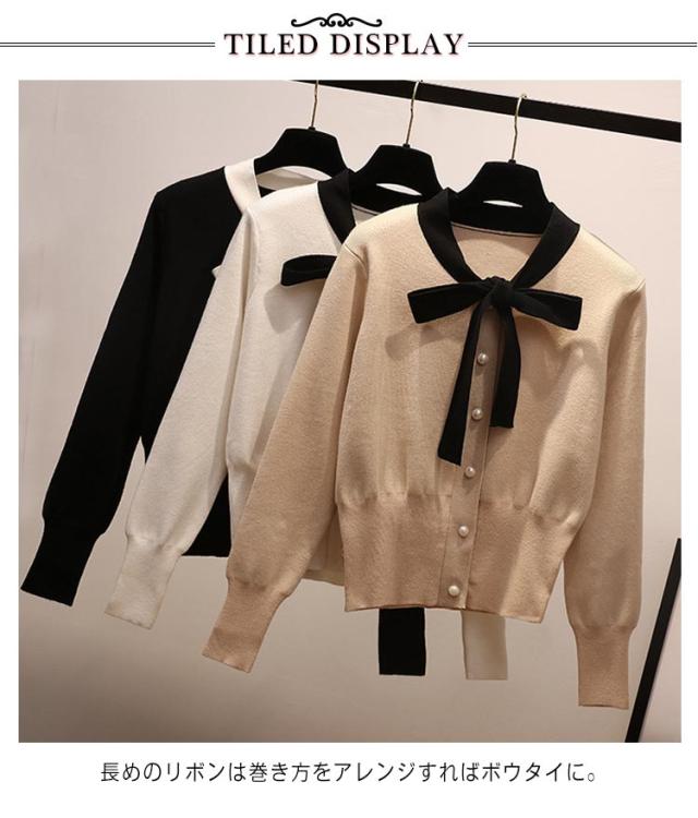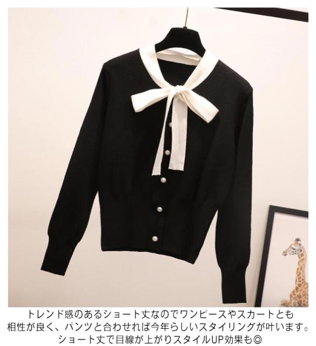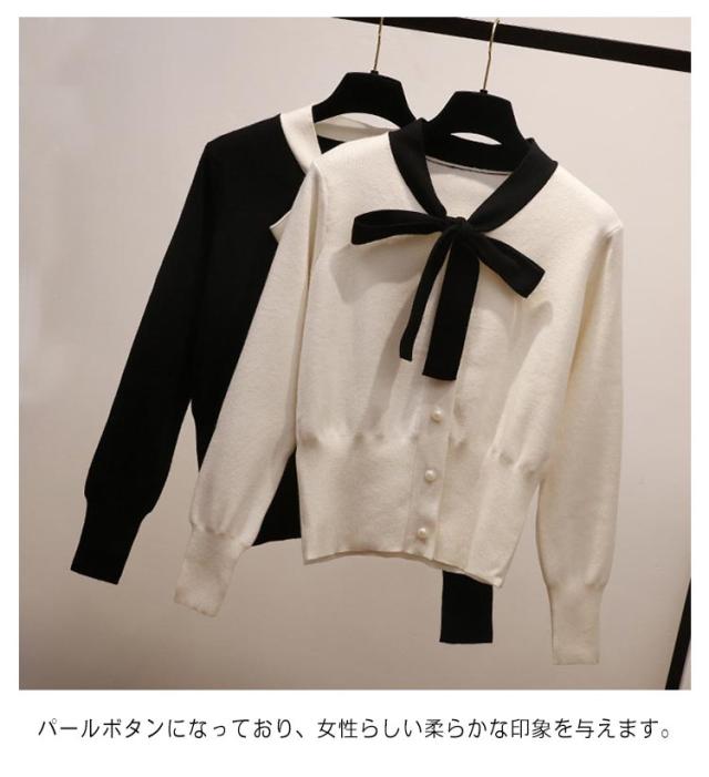 リボン 可愛い セーター リボン 蝶結び レディース プルオーバー トップス カーディガン ボウタイ ニット ボウタイ セーター パイピング ショート丈 秋春 トップス パールボタン フェミニン