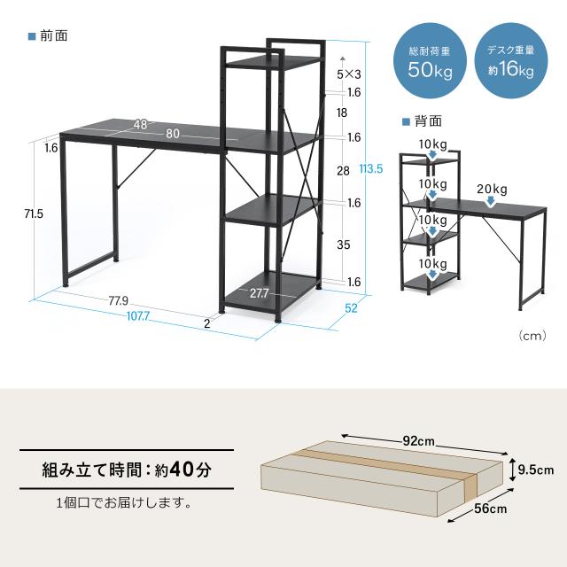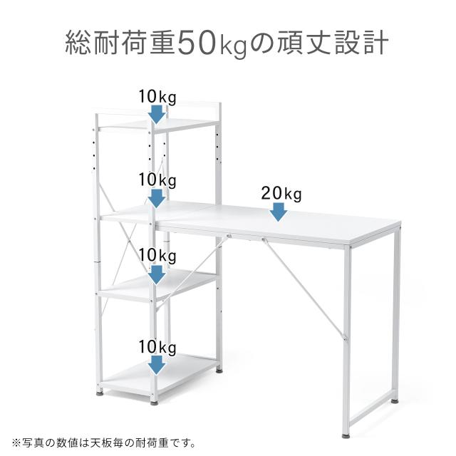 ●耐荷重は、天板20kg、各棚の10kg対応で、パソコンやモニター、棚には書籍やプリンタなどを置くことができます。