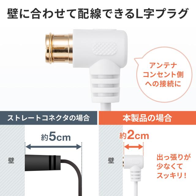 ●片側はL字/差込式、もう片側はストレート/ネジ式のテレビアンテナケーブルです。●L字型コネクタは壁や家具などの狭い隙間に取り付ける場合に最適でストレートと比べ干渉しにくいです。