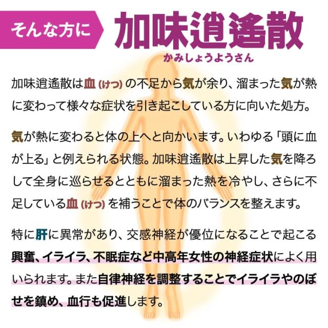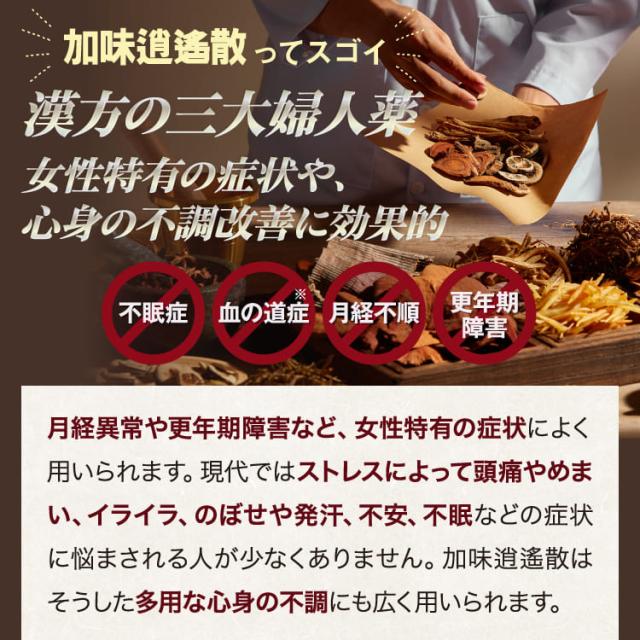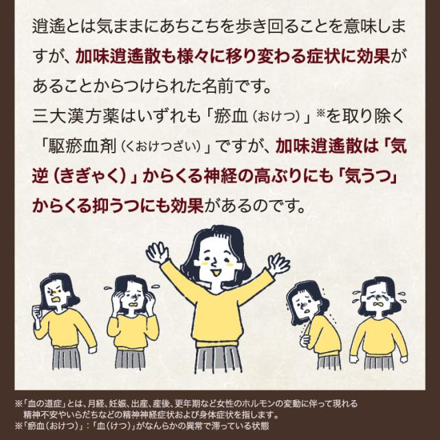 本剤は、中国の宋時代(約1000年前)の古典「太平恵民和剤局方」に収載されている加味逍遙散に準拠して製造されたエキス顆粒剤です。