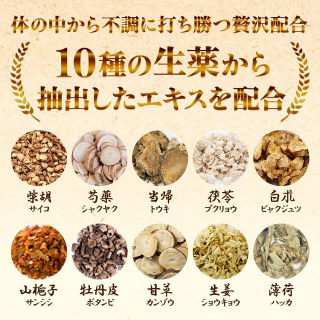 (トウキ:1.5g、シャクヤク:1.5g、ビャクジュツ:1.5g、ブクリョウ:1.5g、サイコ:1.5g、ボタンピ:1g、サンシシ:1g、カンゾウ:1g、ショウキョウ:0.5g、ハッカ:0.5g)