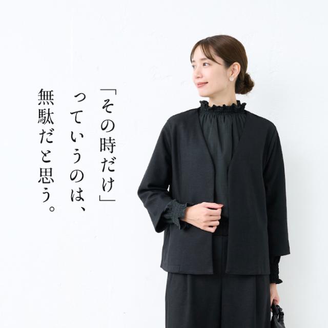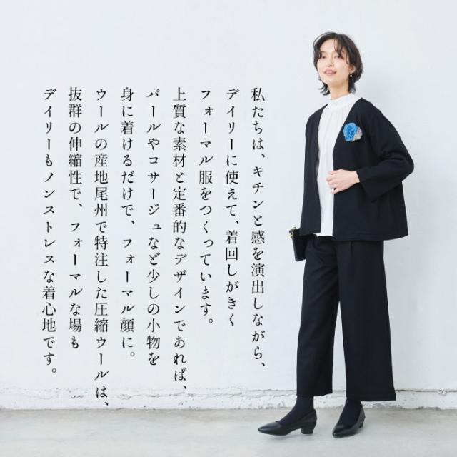 特徴 その時だけっていうのは無駄だと思う。私たちは、きちんと感を演出しながら、デイリーに使えて、着まわしがきくフォーマル服を作っています。上質な素材と定番的なデザインであれば、パールやコサージュなど少しの小物を上手に身に着けるだけでフォーマル顔になります。ウールの産地尾州で特注した圧縮ウールは、抜群の伸縮性で、フォーマルな場もデイリーもノンストレスな着心地です。