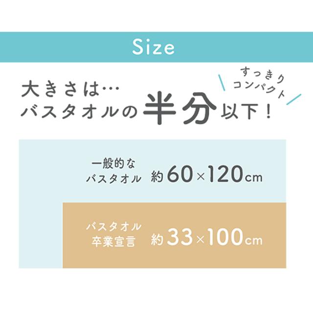 - 本当にバスタオルの代わりになる商品で、出始めの頃からリピート購入しています。フェイスタオルと同じような大きさで洗濯も楽チンです。