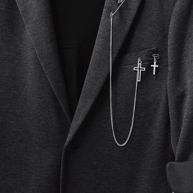 クロス 十字架 メンズ チェーン ブローチ ラペルピン 韓国 クール ストリート ファッション メタル アクセサリー レディース ユニセックス ジャケット おしゃれ スタイリッシュ お洒落 格好良い 揺れる フォーマル ビジネス