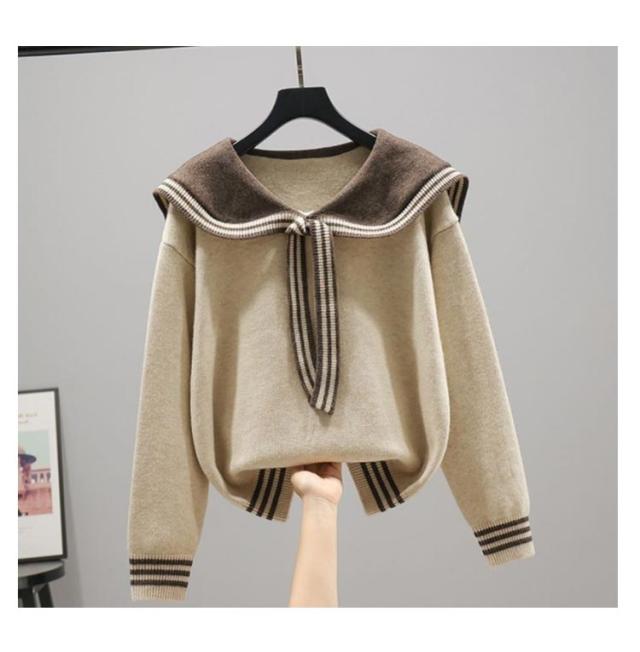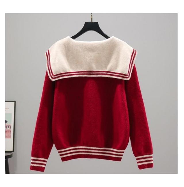 | 配色ラインがアクセント♪ 大きめのセーラーカラーニットセーター。 セーラーカラーが目を惹くデザインは1枚でコーデの主役に◎ 柔らかな肌触りで着心地良く、一枚トップスとしてもアウターのインナーとしても使える。 | |