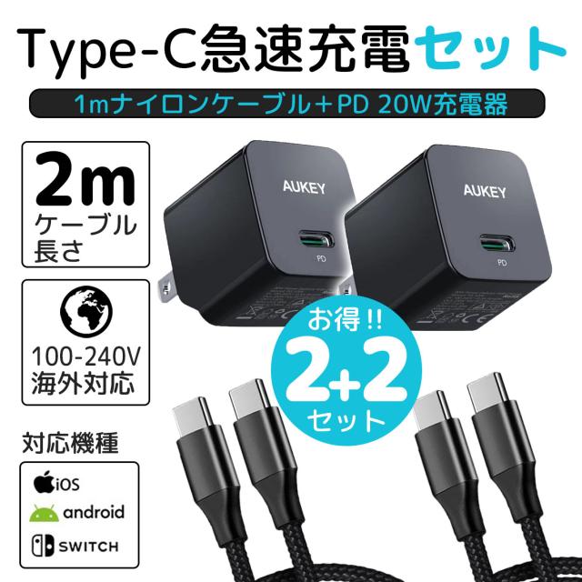 【GLOWTACT お得な2+2セット・iPhone17シリーズも対応】 20W PDアダプター + 2m USB-Cナイロンケーブル 2点セット 充電コード データ iPhone17 iPhone Air iPhone15 iPhone16 iPad Android Galaxy Switch 充電器 充電ケーブル 断線防止 頑丈 ナイロン タイプC TypeC USB-C