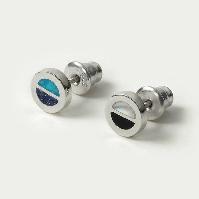 クラッシュターコイズとラピスラズリ、オニキスとシェルがそれぞれ半円ずつセットされたスタッドピアスです。シンプルデザインと天然石の組み合わせがナチュラル感とモード感を両立、洗練された雰囲気を演出してくれます。爽やかなブルーカラーとミステリアスなモノトーンカラー、気分や服装によって着け変えたくなるピアスです。