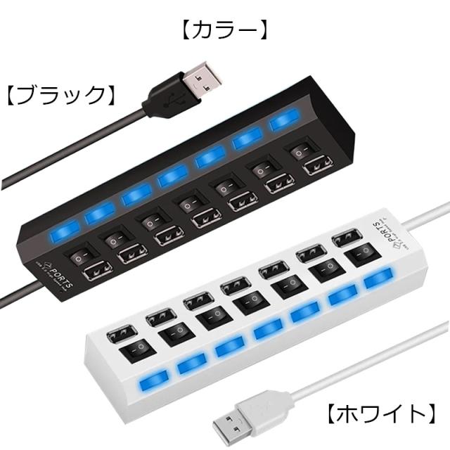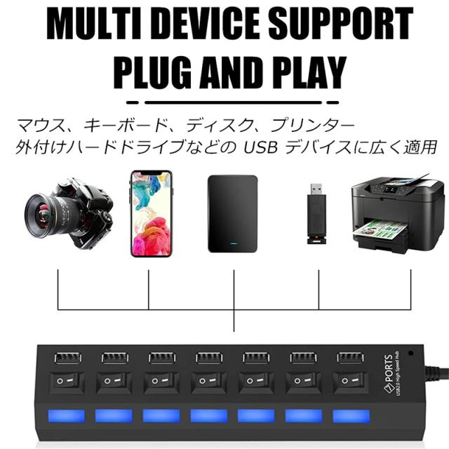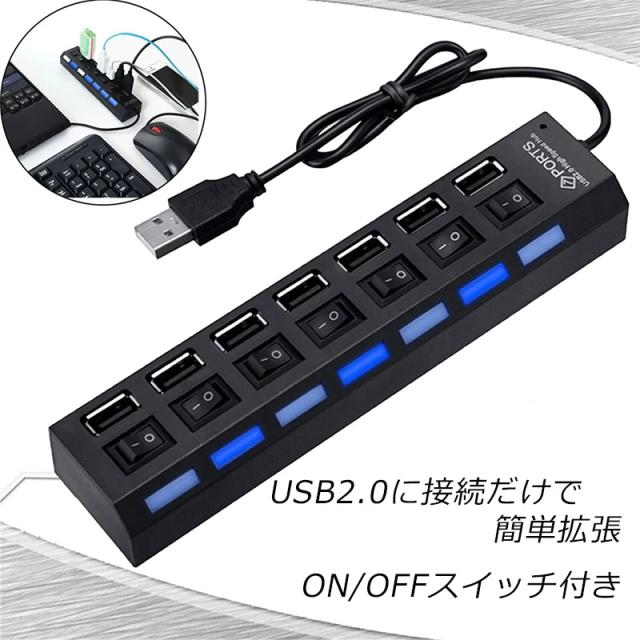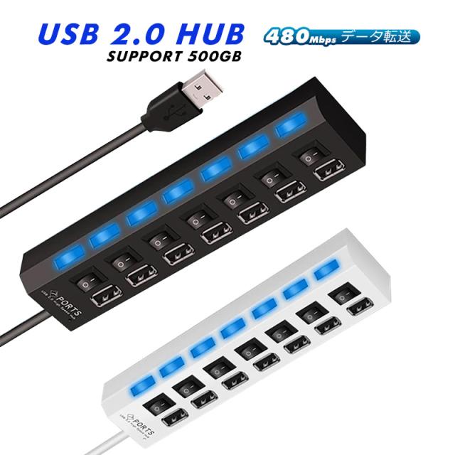 USB2.0/7ポート USBハブ 500mA 個別スイッチ付き USB 延長コード 電源タップ OAタップ ブラック ホワイト