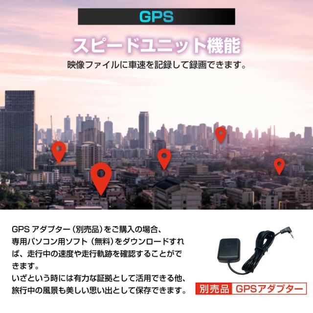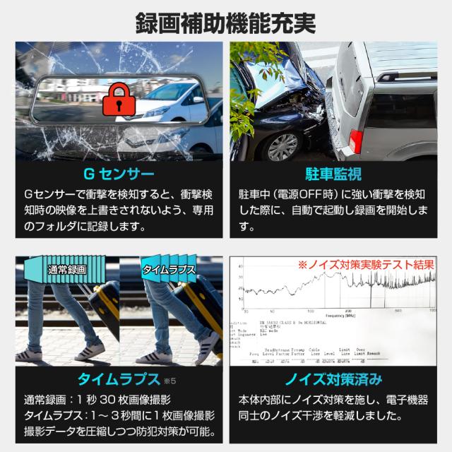 Gセンサー、常時録画、サイクル録画、衝撃録画、駐車監視、タイムラプスなどに対応しています。