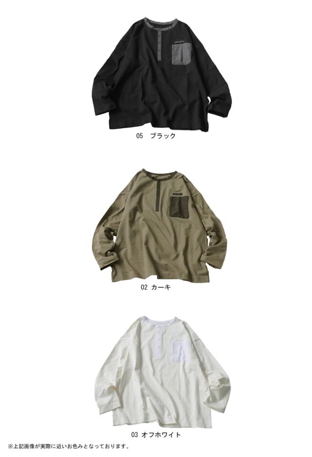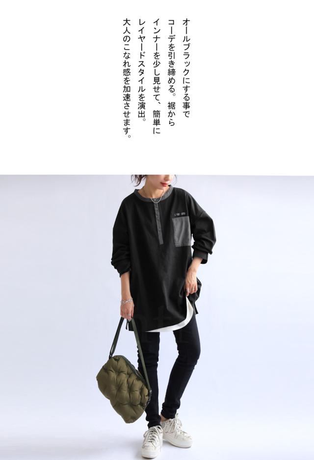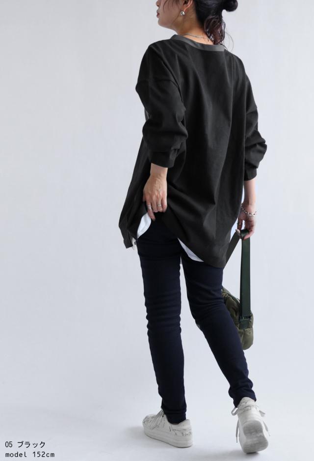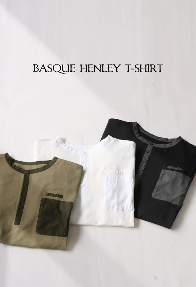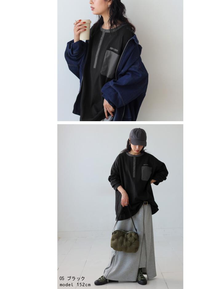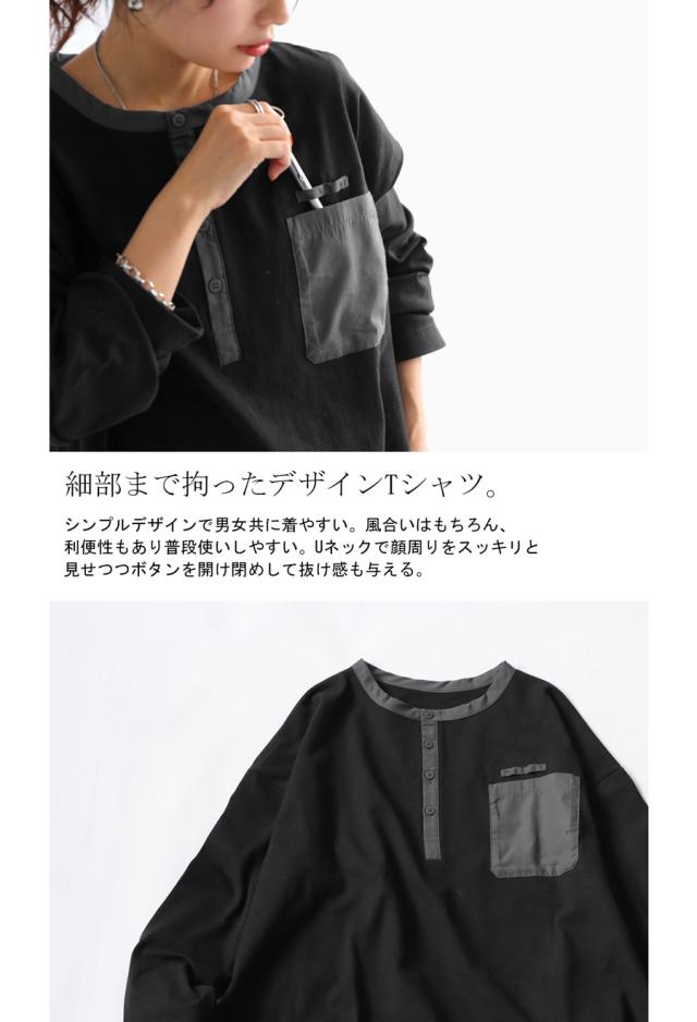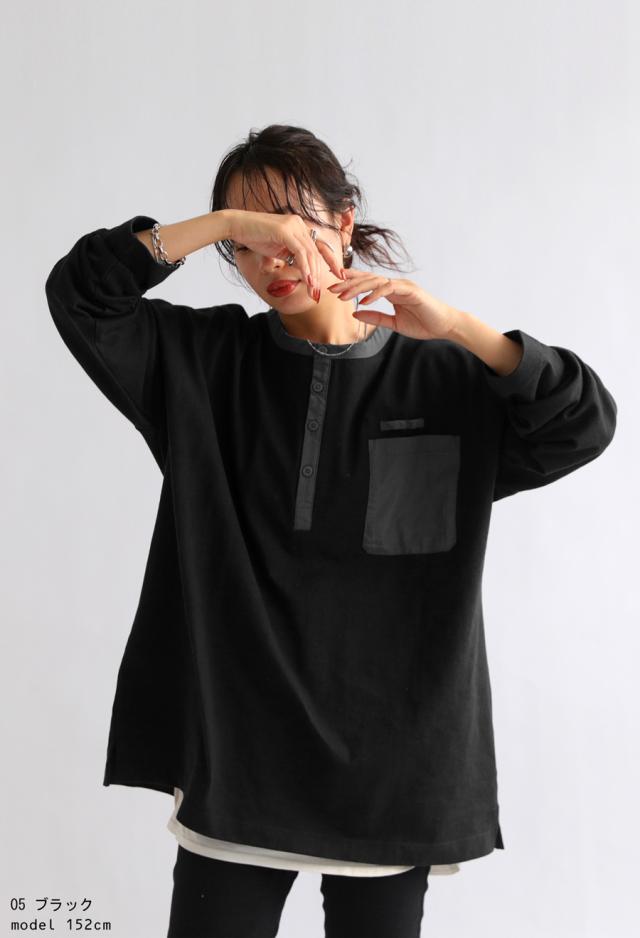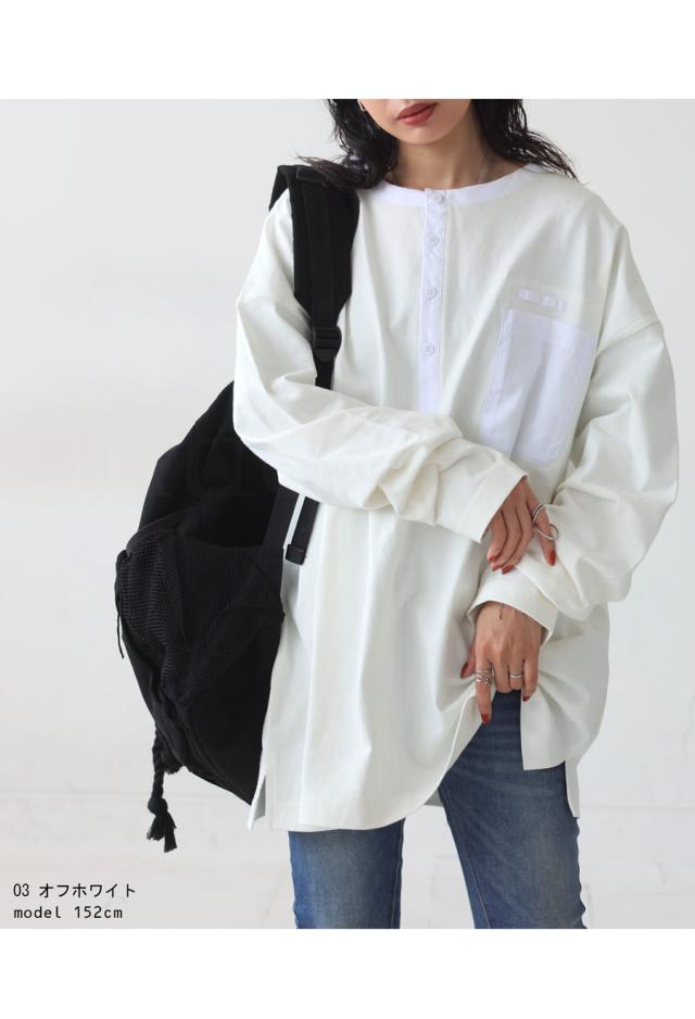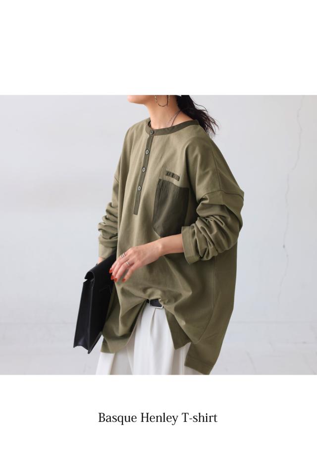 za-00185 ヘンリーネック 綿100 ゆったり バスク シンプル 無地 配色 カットソー バスクT バスクロンT 細見え 着痩せ 体型カバー Tシャツ オーバーサイズ 大きめ 大きいサイズ