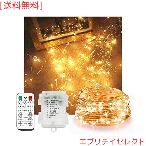 ・防水LEDイルミネーションライト:led イルミネーションライ 電池式 、100電球 、10M、 リモコン、 8種点滅パターンが調節できる。 IP44防水なので、使用範囲がとても広いです(電池ケース部分は水に侵入できません)屋内と屋外の照明に非常に適しています。光色は電球色、LED特有の輝きで、装飾もさらに華やかである。 ・リモコン付き 8種類の点灯パターのイルミネーションライト:リモコ