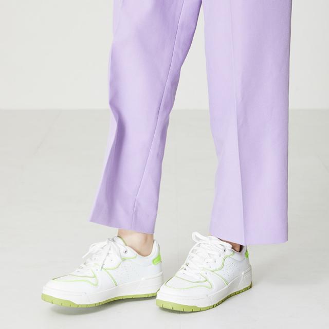 カラーのラインとパンチングデザインを全体に施しスポーティーな雰囲気が今季らしいコートソールスニーカーはラインの色によって全く違う印象を楽しめる。