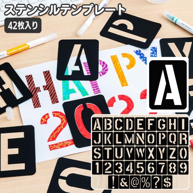 ステンシルシート テンプレート 42枚セット ステンシルプレート 型紙 英数字 英語 数字 アルファベット ロゴ 記号 DIY